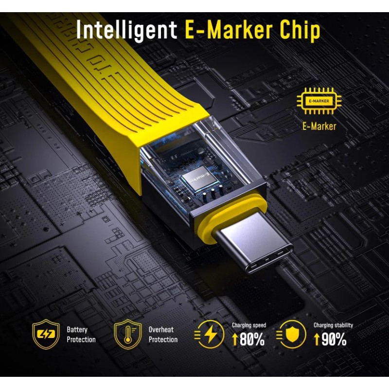 · E-marker Chip Fully Secure Your Safety: The Future Racing Cable has an E-Marker smart chip for stable voltage and current during fast charging, protecting your devices from any harm caused by unexpected fluctuations. This stability not only improves the general health of your devices, but also serves as a safeguard against potential harm caused by overcurrent, overvoltage, overheating, and short-circuiting.