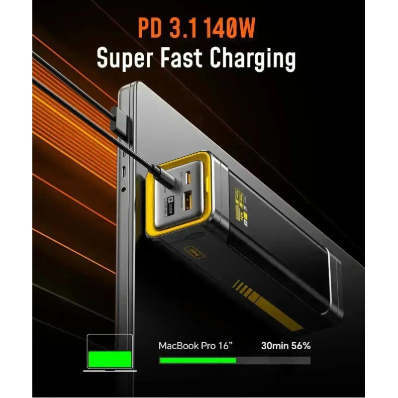 ·       PD3.1 140W Ultra-Fast Charging Technology: Equipped with PD 3.1 technology, both USB-C ports deliver 140W high-speed charging, enabling a MacBook Pro 16" to go from 0% to 56% in just 30 minutes. As the world's unique 2-in-1 power bank and charging station, it allows you to charge the power bank itself at 140W while simultaneously powering other devices for uninterrupted convenience.