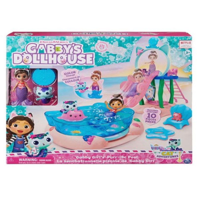 · Get ready for some cat-tastic fun in the sun with Gabby and MerCat, in the 11-piece Gabby’s Dollhouse Purr-ific Pool Playset! Join Gabby and MerCat, with their color-changing mermaid tails, as they spend a fun-filled day out by the swimming pool! Imagine catching some rays with Gabby and MerCat as they slide, splash, lounge in pool floats and enjoy some well-deserved chill time! Kids will love re-creating their favorite pool-side scenes from the show, with the awesome Purr-ific pool Playset! Check other Gabby's Dollhouse collection for endless fun and excitement.
