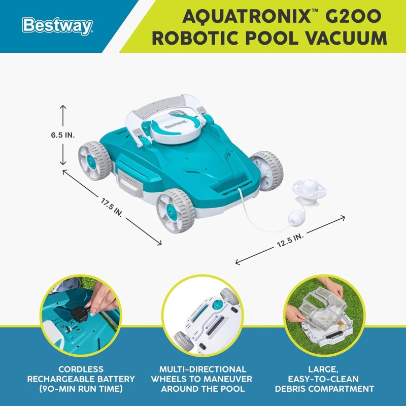 - LET THE ROBOT DO THE WORK: The Bestway AquaTronix G200 Robotic Pool Vacuum is an autonomous, cordless pool cleaning robot that will do the dirty work to keep your pool clean and pristine. The self-propelling design provides an easy way to keep your pool water clean all season long.