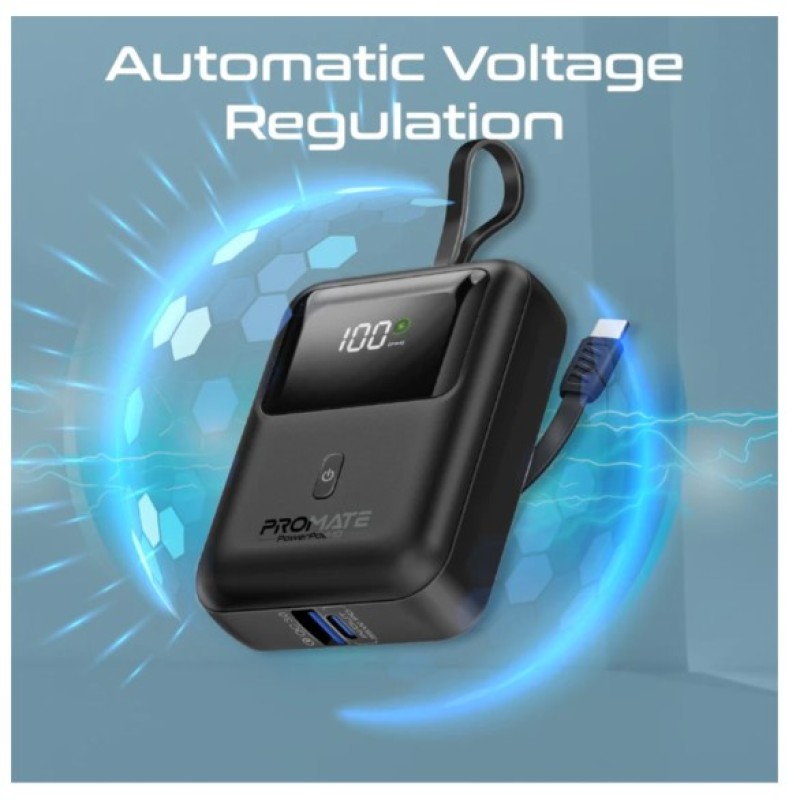 Promate 10,000mAh Ultra Compact 35W SuperSpeed™ Power Bank with Built-In USB-C Cable, POWERPOD-10 – Black