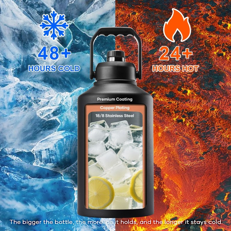 - ICE-COLD FOR DAYS: With our ThermoArmour technology and triple-layer vacuum insulation, our gallon water bottles lock in chill for 48+ hours and keep drinks hot for 24+ hours. Pro tip: the bigger the bottle, the more ice it holds, and the longer it stays cold