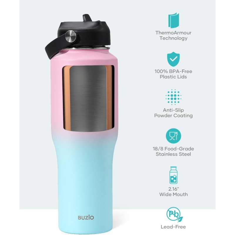 · Meet your new favorite travel companion, the BUZIO Trophy Series 32oz Water Bottle. This T-shape design is specifically made to slide into your car cup holder easily.
