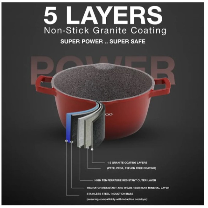 Durable 5-Layer Non-Stick Granite Coating: Scratch-resistant and free from chemicals for healthier in addition to the non-stick feature, makes the food slide easily on the pan and pot, and helps in cleaning up faster.