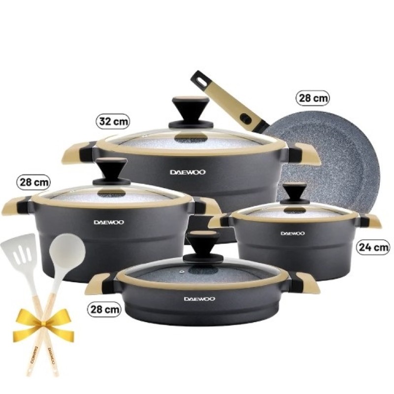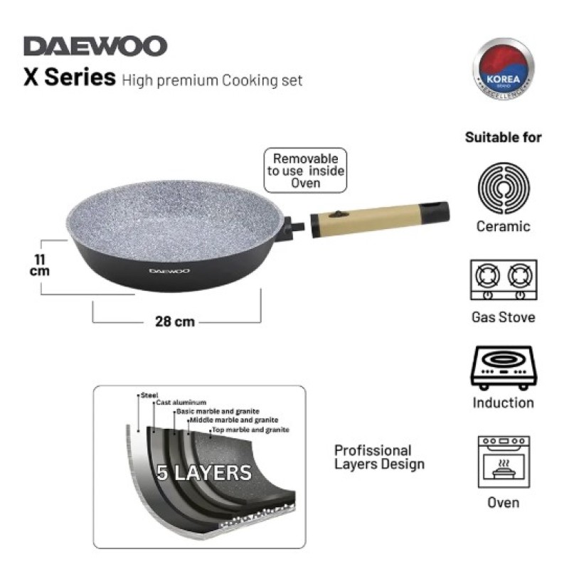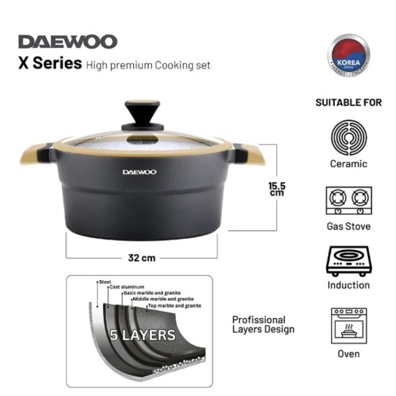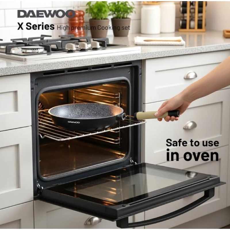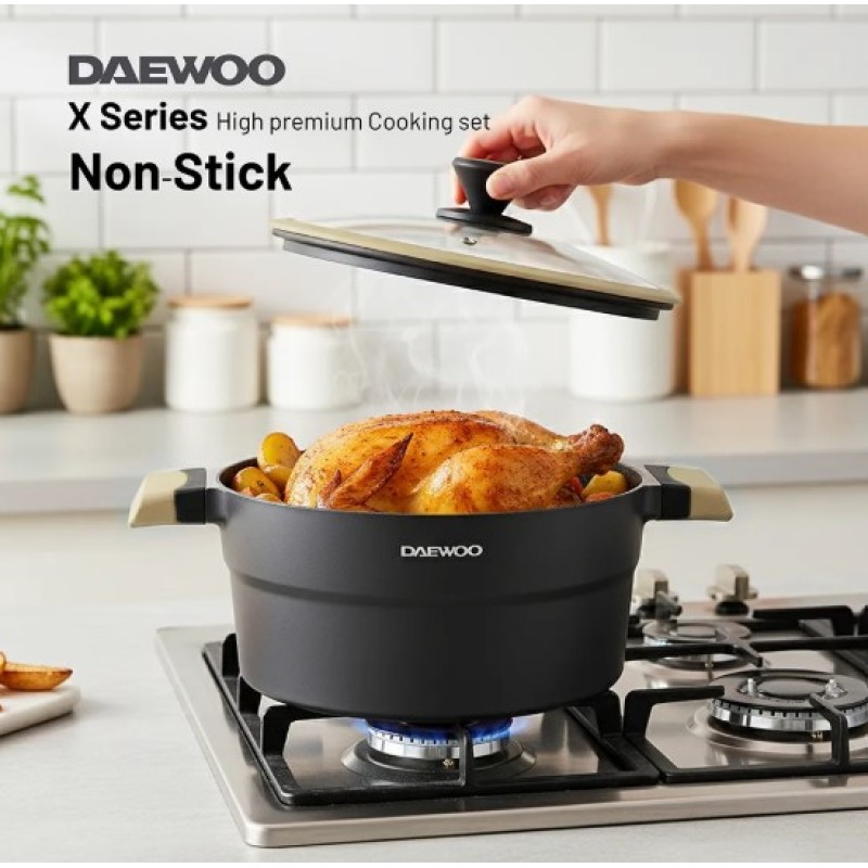 Discover excellence in every meal with the Daewoo 9-Piece X Series Cookware Set. Designed to deliver elegance, durability, and versatility, this set combines the strength of die-cast aluminum with a premium 2-layer non-stick marble coating for effortless cooking and easy cleanup. Whether you're creating everyday meals or exploring new culinary techniques, the Daewoo X Series offers superior performance across every stovetop, including induction.
