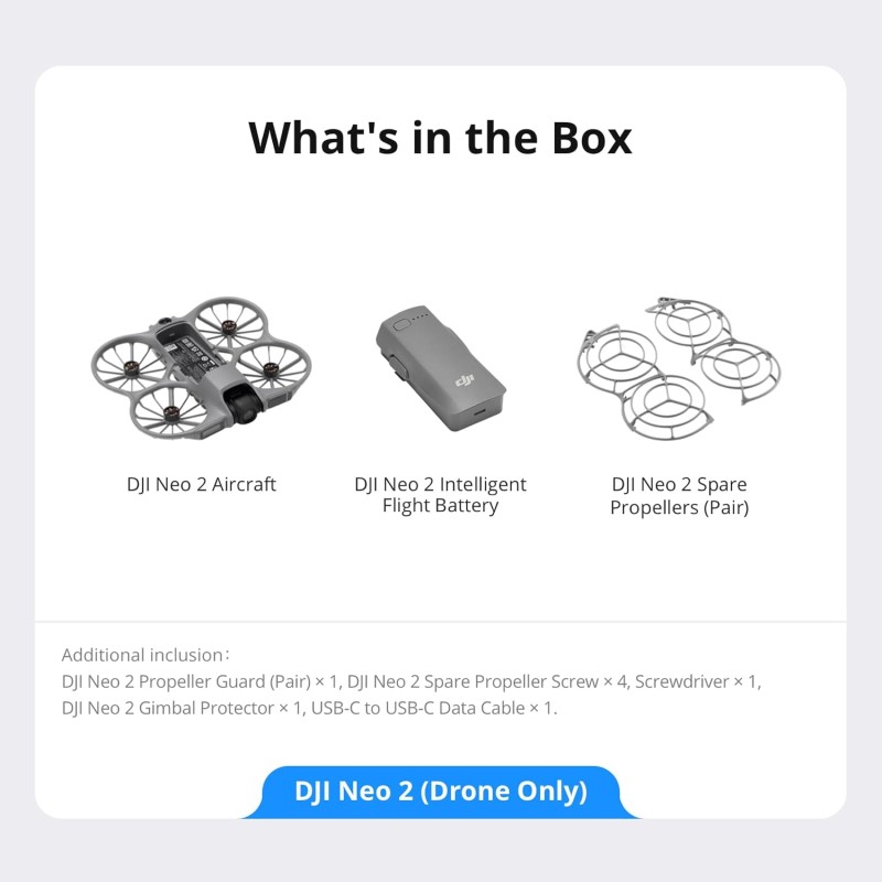 - Includes DJI Neo 2, one battery, propeller guards, and more for a smooth and easy start to your flying experience.