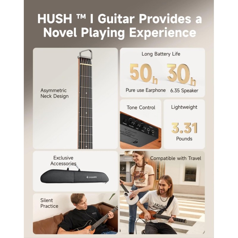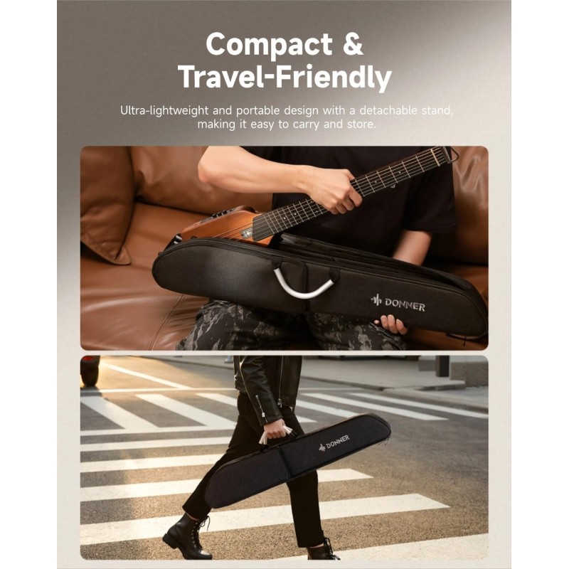 Donner’s HUSH I portable guitar is as lightweight as a laptop. It features a