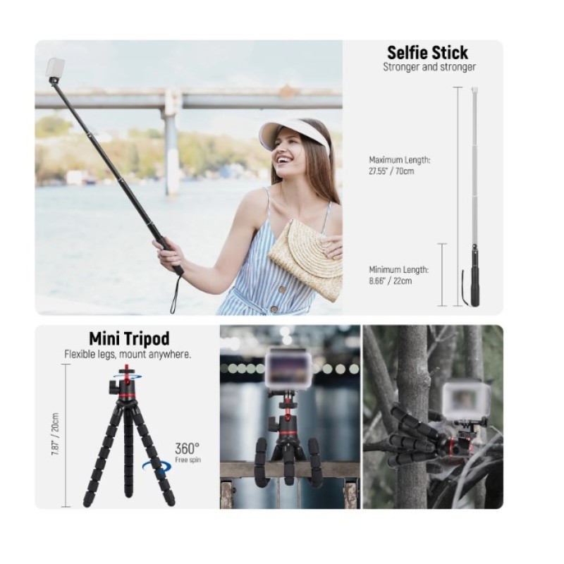 • Flexible Tripod & Selfie Stick- The flexible tripod with bendable legs can wrap around branches and posts, and keeps your camera stable on uneven grounds. The lightweight selfie stick makes it easy to take selfies or videos on the go