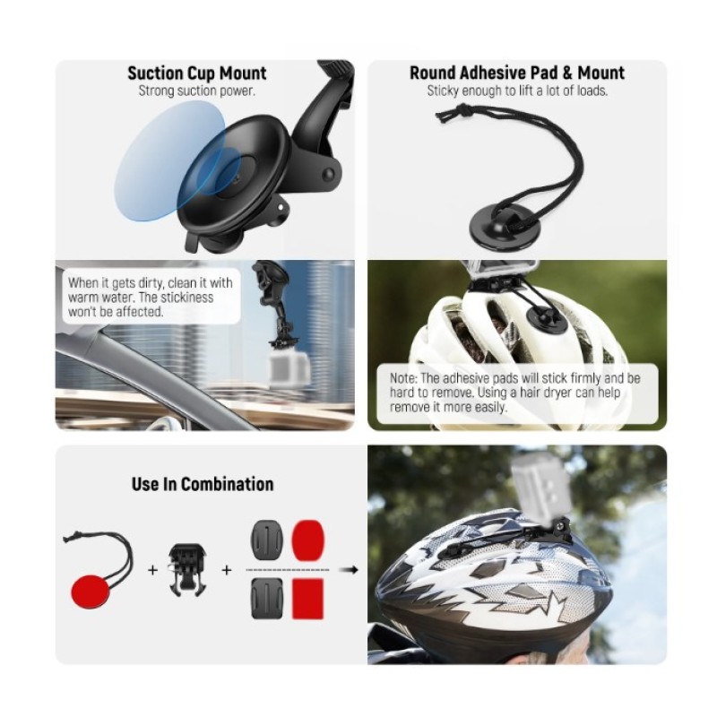• Bike Mount & Suction Cup- Mount your camera on the handlebars of your bike with the handlebar mount. It fits bars 0.75”/1.9cm to 1.4”/3.6cm in diameter and supports 180° tilt. The suction cup attaches your camera to the car for recording footage on the road