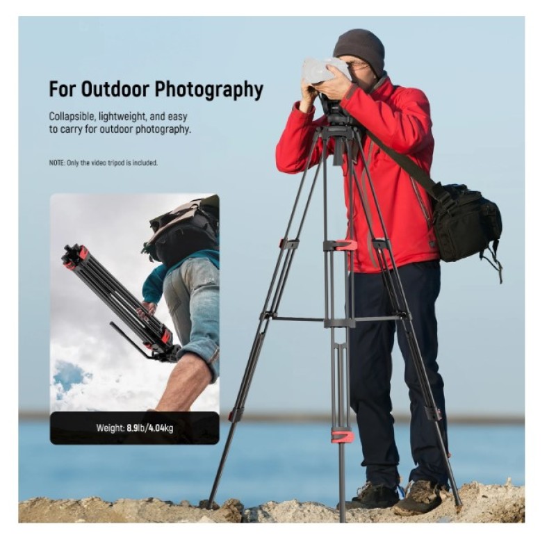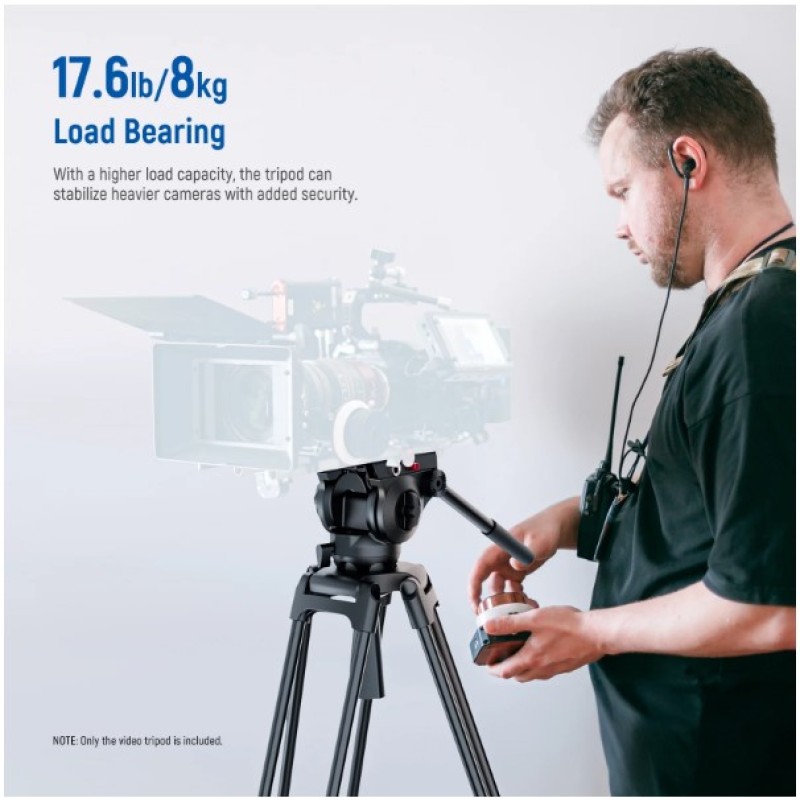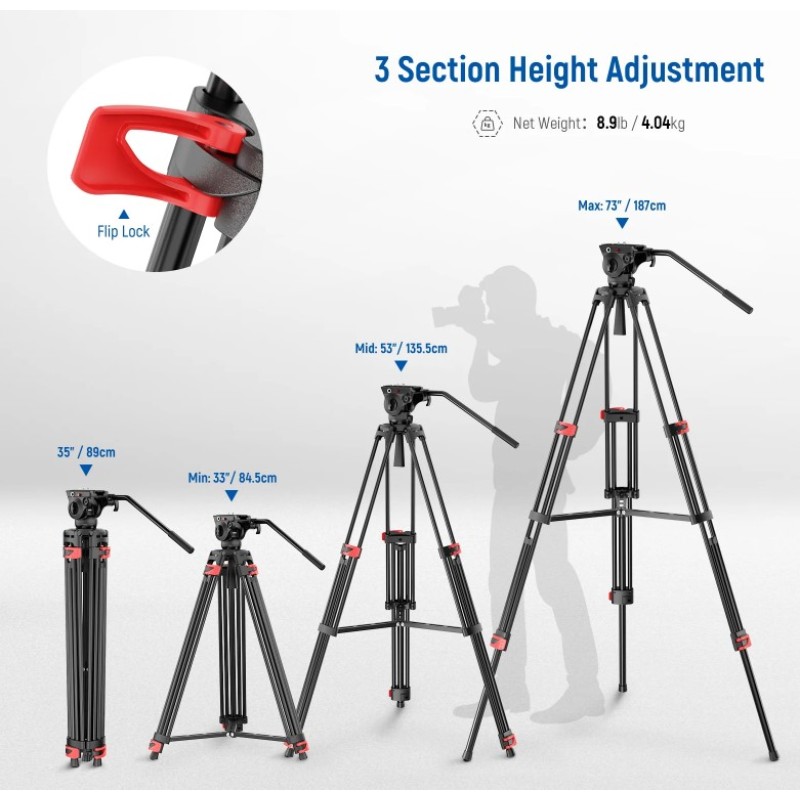 • Stable Metal Video Tripod (Basic Version)- This all metal fluid head tripod offers exceptional stability, and is built to withstand rigorous use. Each tripod leg is made of multiple row tubes, with a triangle mid spreader, and a 73mm enlarged chassis to support up to 17.6lb/8kg. The nonslip rubber feet provide stable support on any terrain and are wear resistant for long lasting durability, perfect for filming, and video recording, and ideal for parties, weddings, sports events, landscapes, etc.