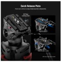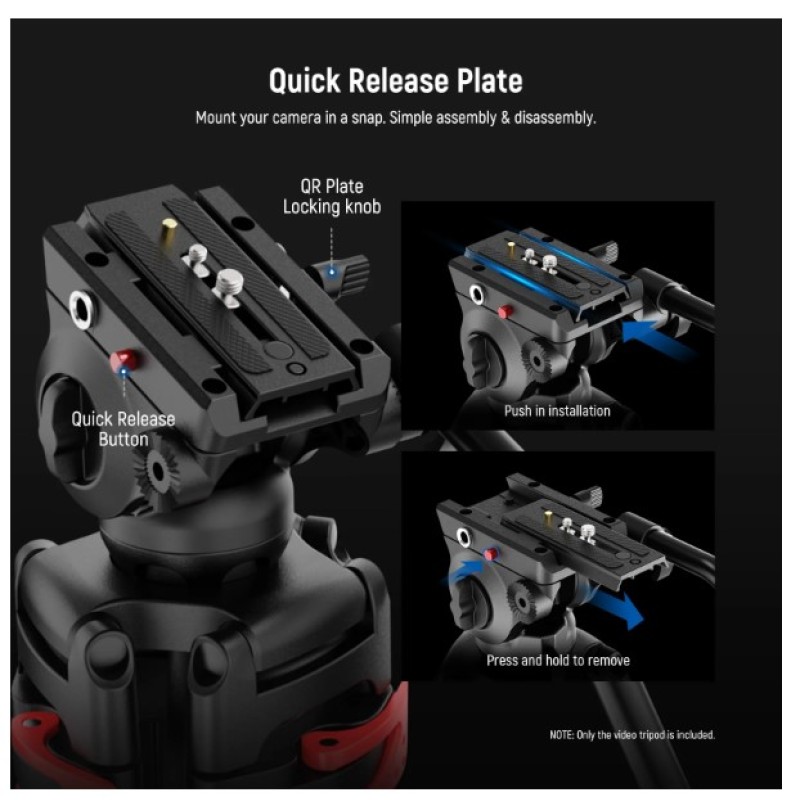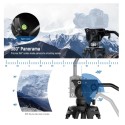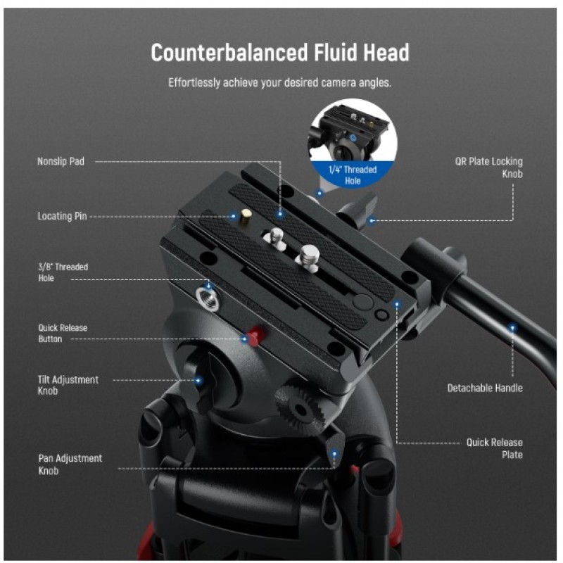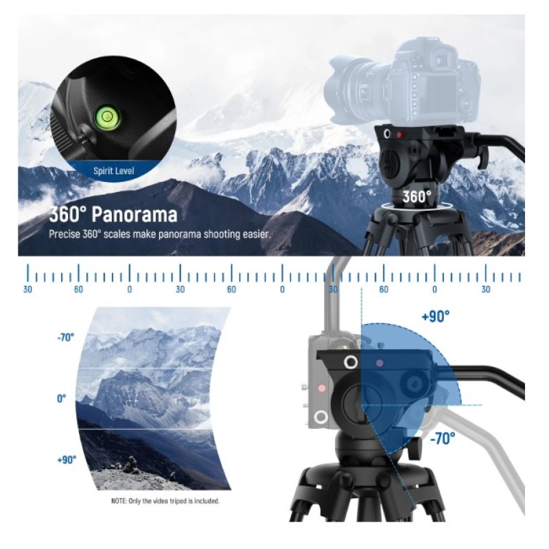 • Damped Fluid Head- Capturing high quality videos using this fluid head, providing 360° pan and -70°/+90° tilt for versatile shooting angles, and smooth and controlled movements. Also includes a bubble level for quick, accurate horizontal alignment, and a detachable handle for a different dominant hand
