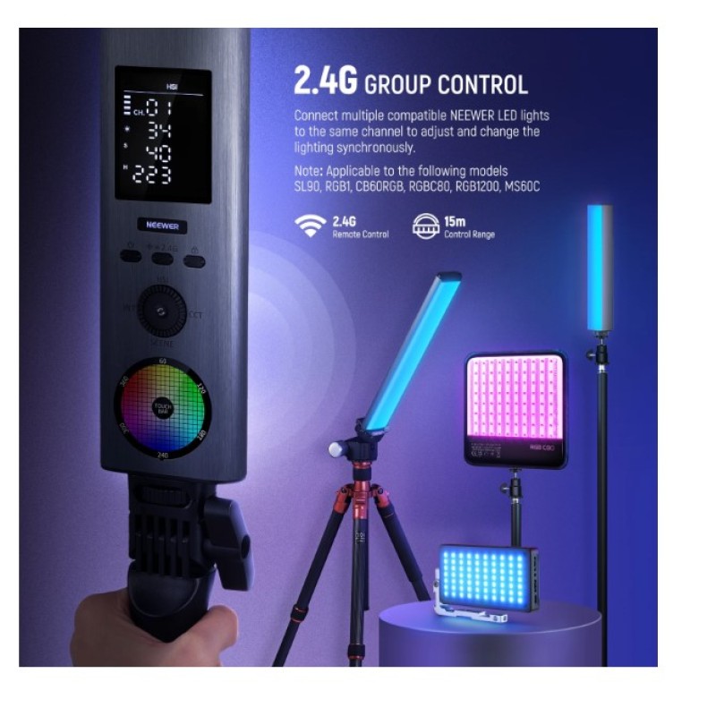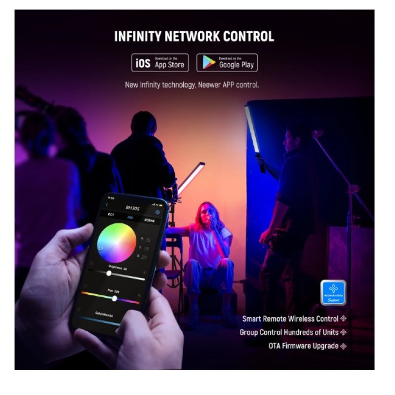 • Advanced App & 2.4G Remote Control- Control BH-30S in 3 ways. Infinity App Control: Use the NEEWER app for smart group remote control of more than 255 lights, and OTA firmware upgrade within 49ft (15m). 2.4G Control: No pairing is needed for controlling several lights of different models. Just set them on the same channel and control all of them simultaneously within 66ft (20m). On Board Control: Adjust light via control buttons and the touchable RGB color mixer