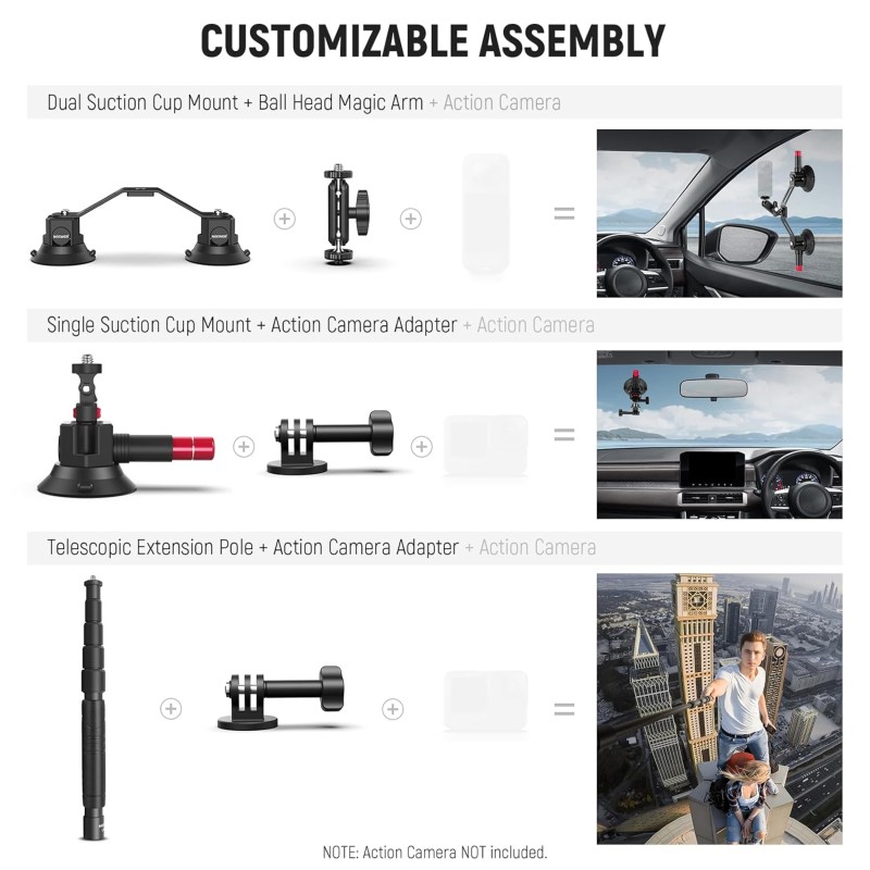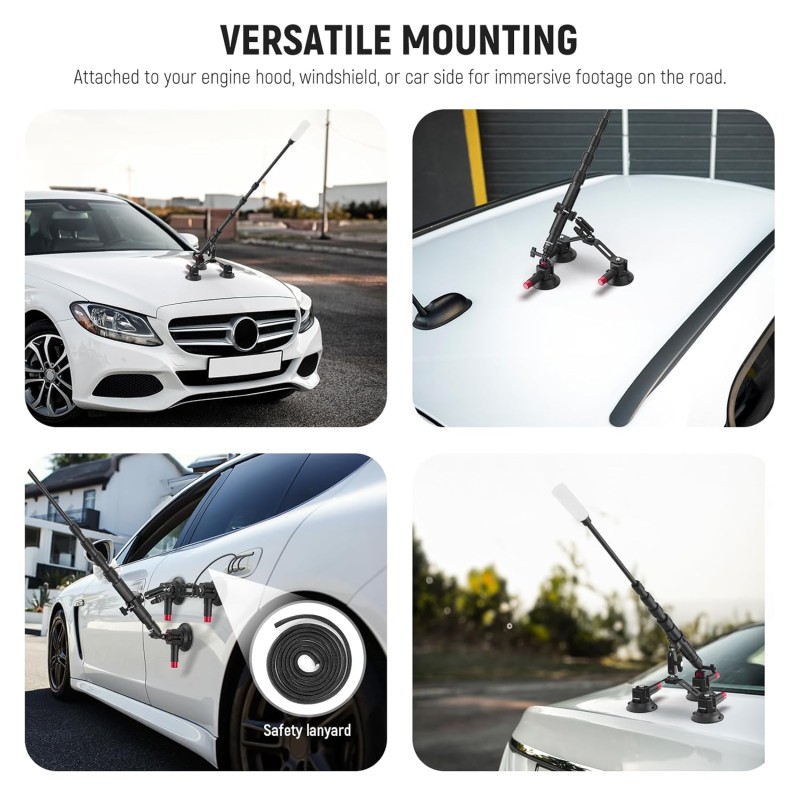 - Triple Suction Cup Car Mount Kit- Capture immersive POV (point of view) footage from unique driving angles like your engine hood, windshield inside/outside, car dash, or car side. The suction cup camera mount stand holder securely attaches your action camera with three powerful suction cups, and enables flexible positioning with extension poles and a ball head magic arm for video recording, with a safety lanyard for added safety. Note to use at speeds below 80 km/h to prevent accidental drops