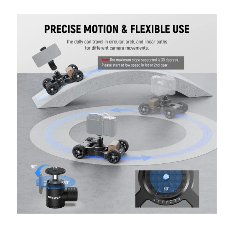 - Precise Motion & Flexible Use- The camera dolly manually moves along circular, arched, and linear paths, with left or right +/-30°, and provides 5 speed levels (60s/m, 50s/m, 35s/m, 25s/m, 15s/m) for precise control, ensuring real time adjustments while shooting. The included ball head with a pan base and a U shaped notch for 360° rotation and 90° tilt angles. Note: Avoid starting the camera dolly at the 5th speed level when climbing slopes to prevent shaking