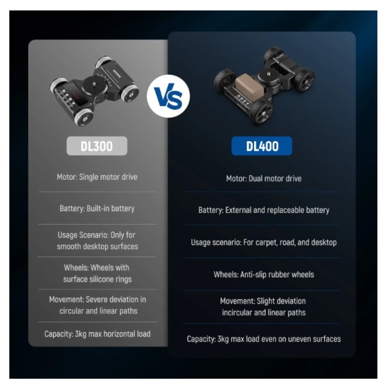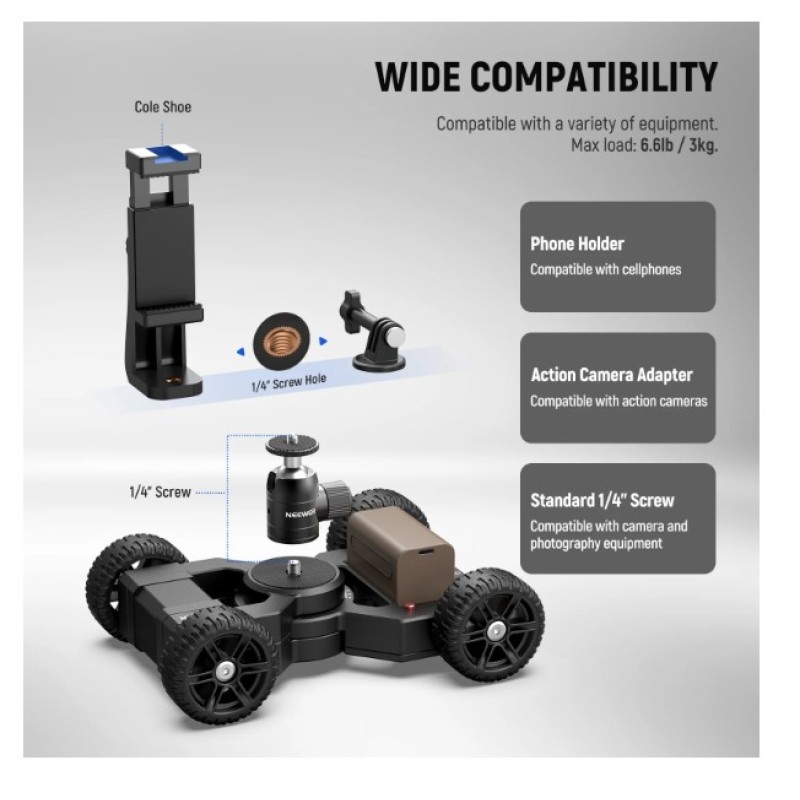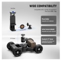 - Enhanced Motorized Camera Dolly Kit- The DL400 motorized camera slider car upgrades with ultra quiet dual motor and nonslip rubber wheels with two front wheel drive, handles up to 6.6lb/3kg for smooth move and uninterrupted video recording (below 30db). Enhanced grip on most surfaces, not just floors and desktops. The 360° ball head, phone holder, and action camera adapter accessories are included for the top 1/4" screw. Compatible with Canon Sony Nikon Fujifilm fuji mirrorless vlog cameras