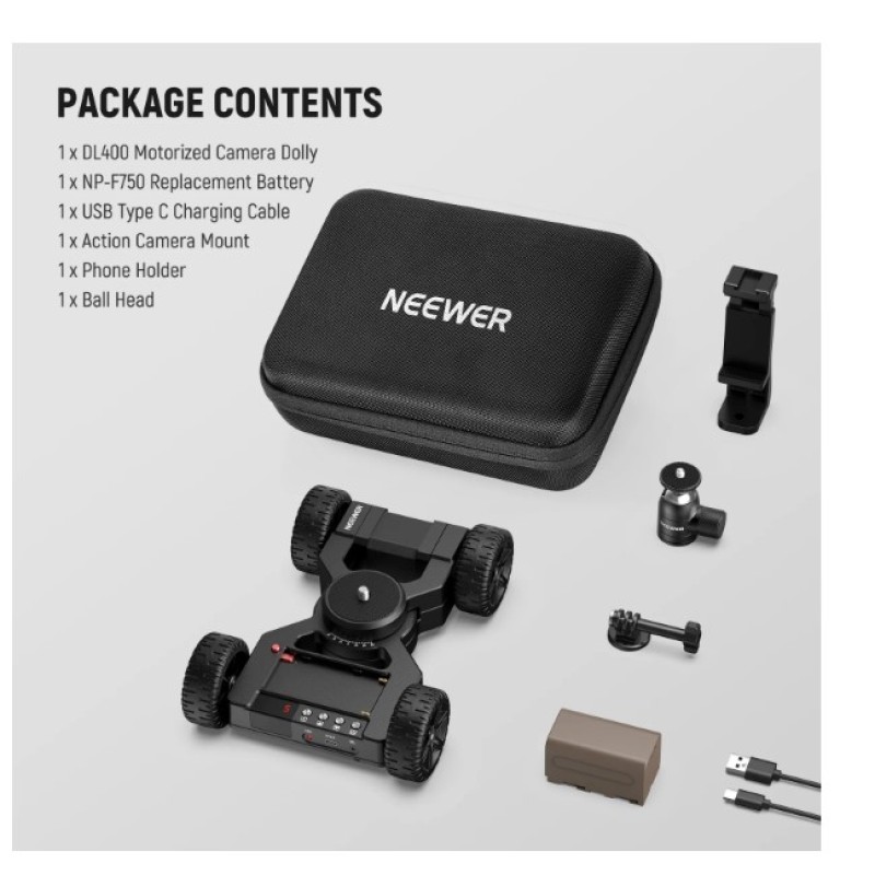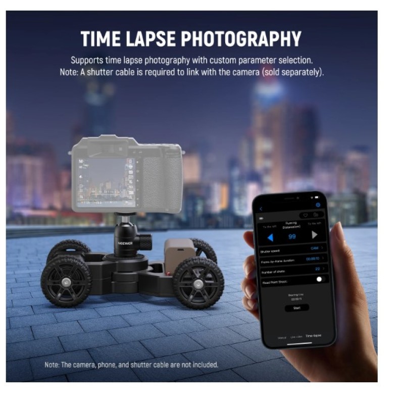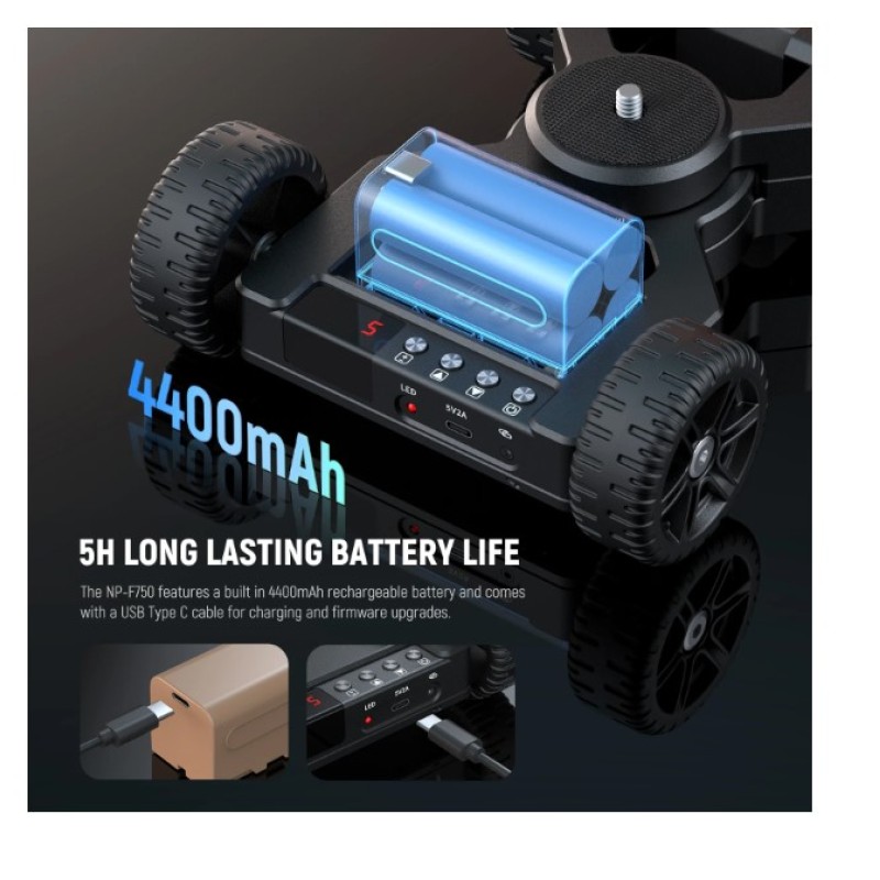 - Smart APP Mobile Control- Using the NEEWER App, you can wirelessly control the motorized dolly from your iOS or Android device. With the Manual, Live Video, and Time Lapse modes, you can personalize your shots and save presets for next time use. The NP-F750 rechargeable battery supports up to 5 hours of runtime, and a USB Type C cable for charging and firmware upgrade