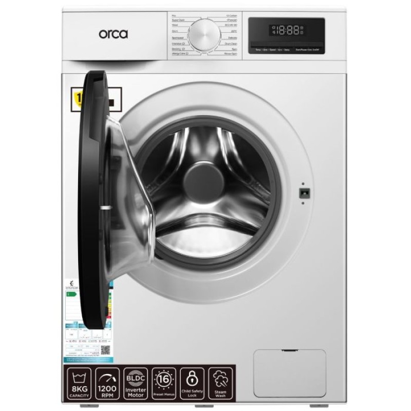 Orca Front Load Washing Machine 8KG 1200RPM BLDC, White - OR-TWF80EW