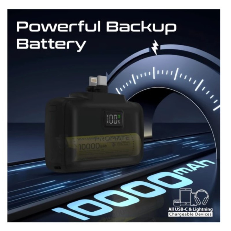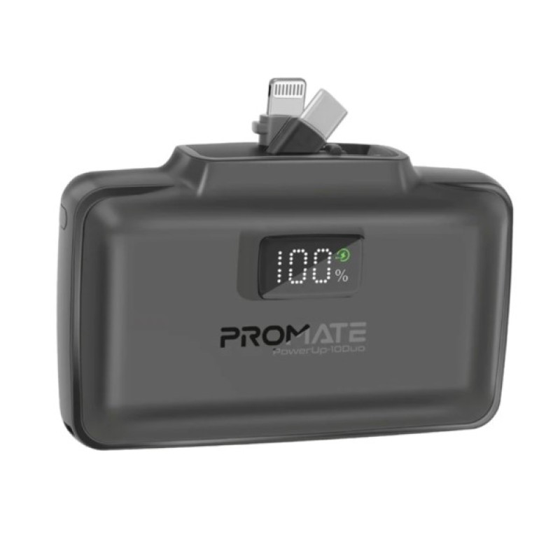 · Introducing PowerUp-10Duo, a revolution in portable power and another first-to-market product from Promate, with an unprecedented capacity-to-size ratio. This sleek, mini power bank packs serious energy thanks to a powerful 10,000 mAh battery, which provides double the power versus other mini power banks available in the market. With built-in foldable 20W USB-C™ and Lightning connectors, plus an additional 20W USB-C™ in/out port, it effortlessly charges multiple devices at lightning-fast speeds. The LED battery display keeps you informed, while advanced overcharging and overheating protection ensure safety with every charge. Designed for life on the go, the PowerUp-10Duo fits seamlessly into your pocket or bag and even features a convenient integrated kickstand, making it the perfect travel companion. Stay charged, stay ready, and stay ahead with Promate.