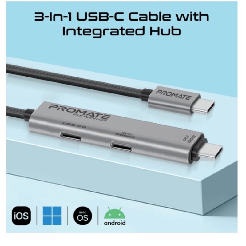 • Introducing Promate’s PortLink-C3, the ultimate 3-in-1 USB-C Cable with an integrated dual USB-C port hub, designed to revolutionize your connectivity experience. With a high-speed 5Gbps USB-C connector and 100W power delivery, this cable ensures ultra-fast data transfer and efficient charging.