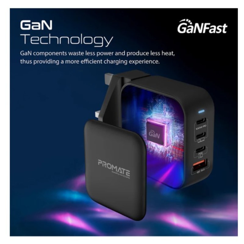 Promate 100W Power Delivery GaNFast™ Charger with Quick Charge 3.0 - GANPORT4