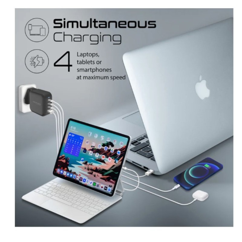 ·       Upgrade to super speed 100W charging with GaNPort4-100PD. Featuring Gallium Nitride components provide an efficient charging experience with less heat and a 55% smaller form factor. Charge 4 laptops, smartphones or tablets at the same time and maximum speeds. Universal 100V-240V voltage and UK/EU pin converters let you use the GanPort4-100PD in any country. Travel-ready super speed charging with GaNPort4-100PD.
