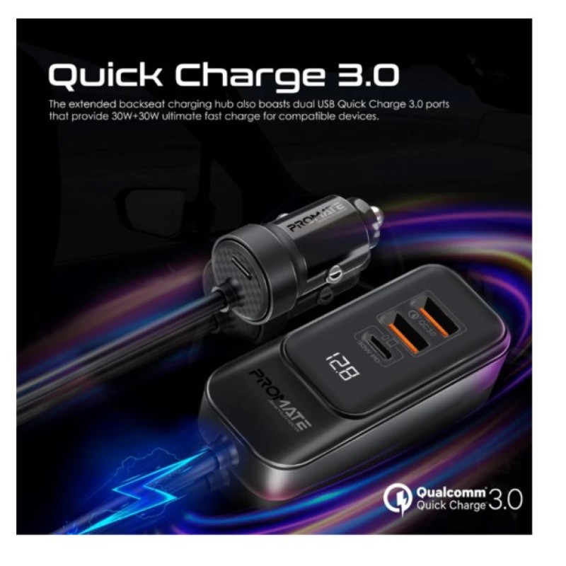 ·       Equipped with a USB-C Power Delivery Port on the car charger and one on the extended charging hub, you can power two devices at 30W each. The backseat charging hub also boasts dual USB Quick Charge 3.0 ports that provide 30W ultimate fast charge in each port, so you can share the power on the go. This stunning car charger also has a real-time LED voltage display screen that keeps you informed about the power your device receives and a multi-protection system so you have a pleasant and safe charging experience.