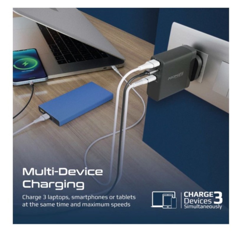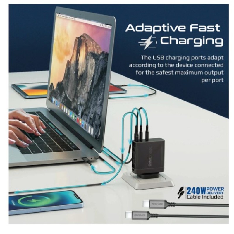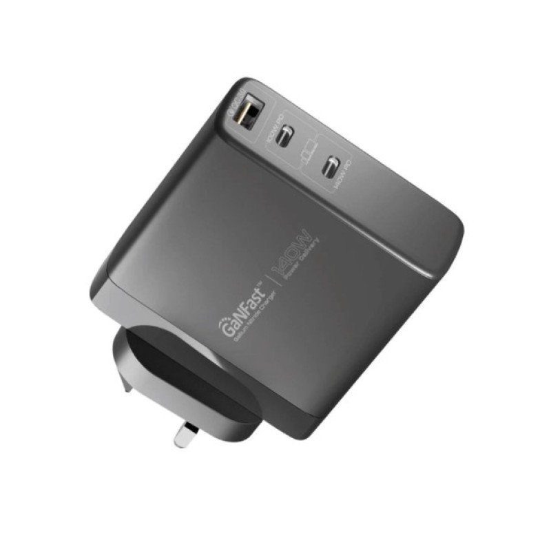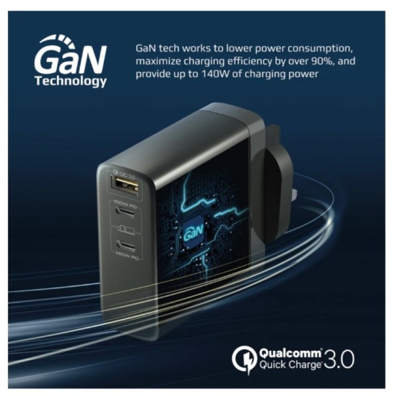 · GaN tech works to lower power consumption, maximize charging efficiency by over 90%, and provide up to 140W of charging power. Charge 3 laptops, smartphones or tablets at the same time and maximum speeds. The USB charging ports adapt according to the device connected for the safest maximum output per port.