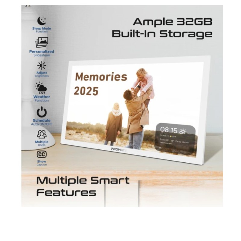 • This Full HD 15.6” touchscreen digital photo frame combines elegance and innovation to keep your cherished moments alive. Its stunning 1920x1080 resolution displays every photo in vibrant clarity, while the 32GB built-in storage and wireless connectivity ensure your favourite memories are always at your fingertips.