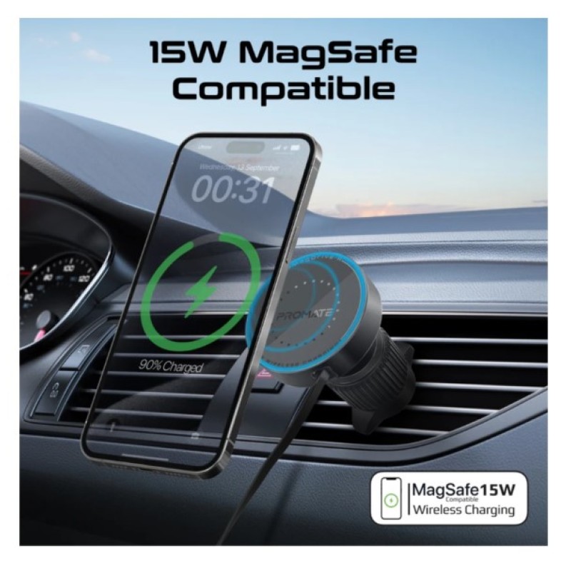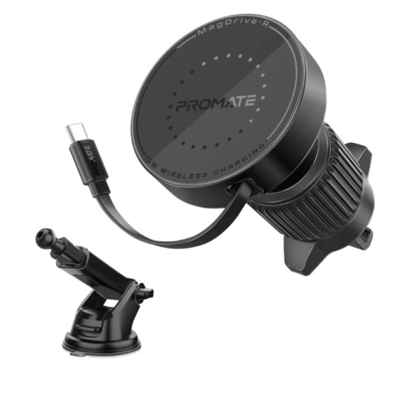 Promate 15W MagSafe Compatible Car Wireless Charger with Retractable Cable - MagDrive-R