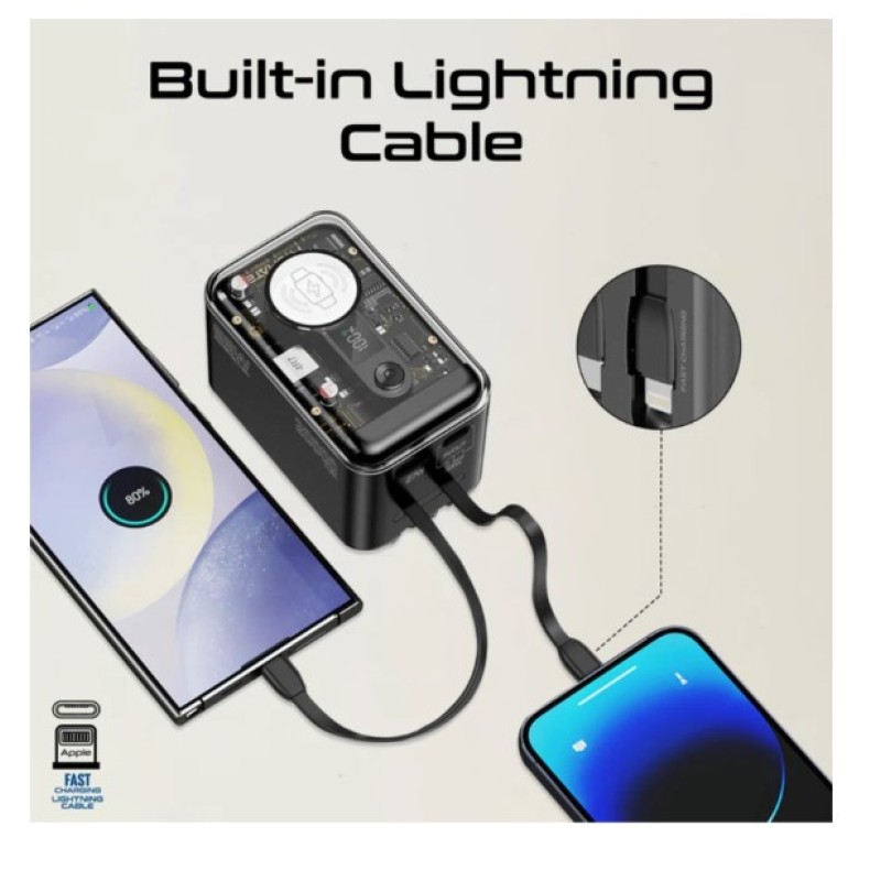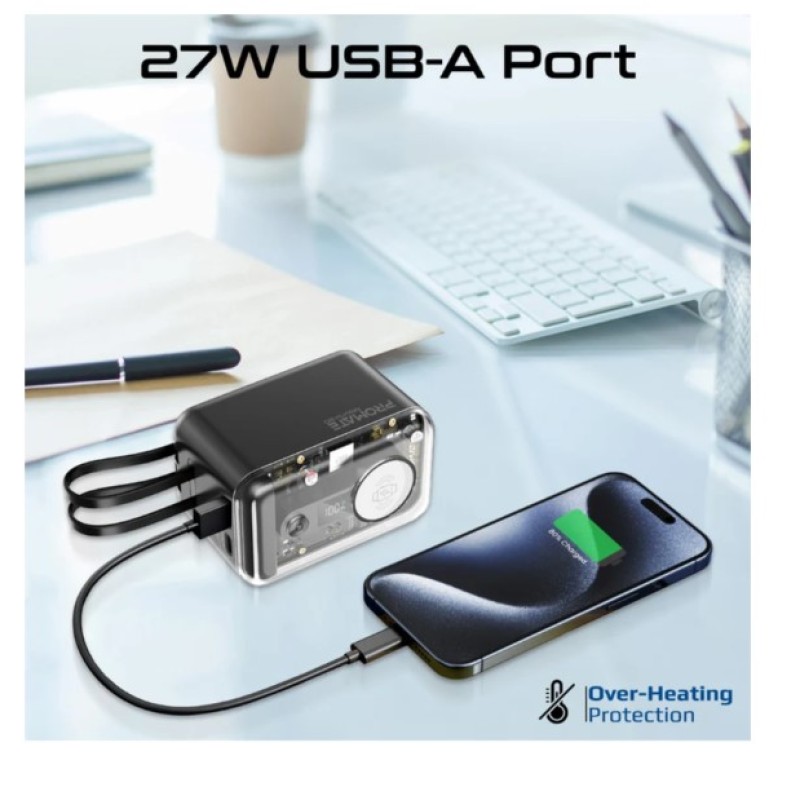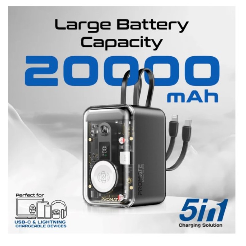 · Introducing Promate’s Mavrix-20, the ultimate power solution designed for the modern tech enthusiast. With an impressive 20000mAh battery capacity, this powerhouse keeps all your devices charged and ready. Featuring built-in USB-C and Lightning cables, a 65W PD USB-C port, and a 27W USB-A port, Mavrix-20 ensures you have every charging option at your fingertips. Plus, it includes a dedicated 3W Apple Watch charger for added convenience. Wrapped in a sleek, modern transparent design and equipped with a real-time LED display, the Mavrix-20 is not just a charger—it's a statement of style and functionality. Experience next generation portable power with Promate.