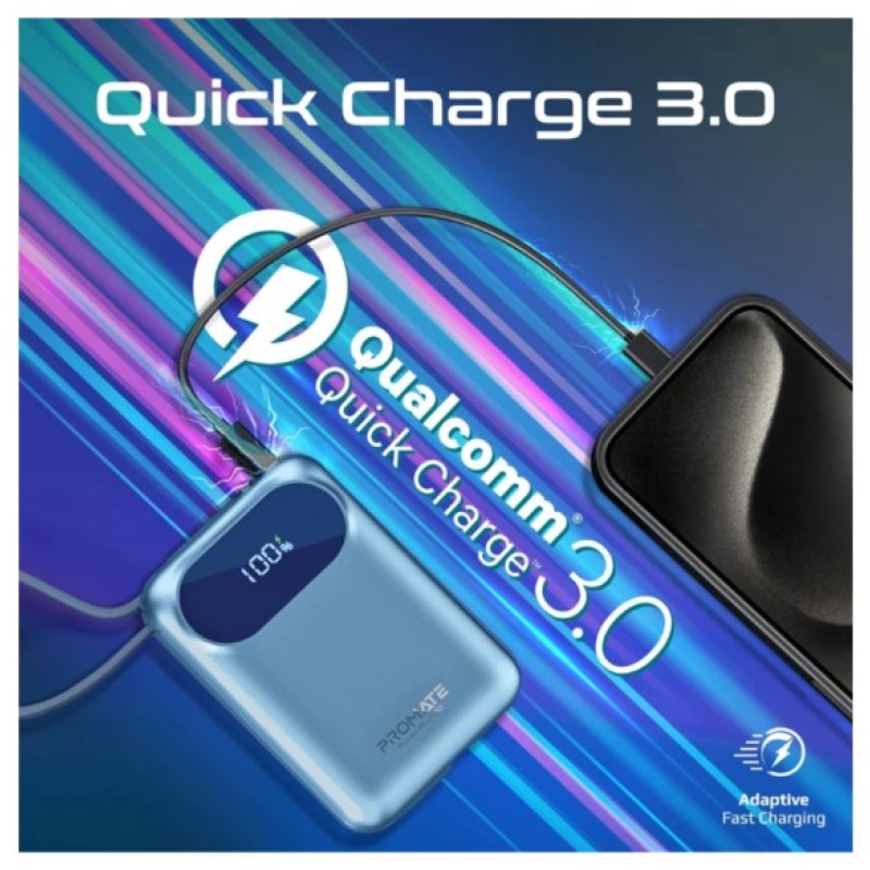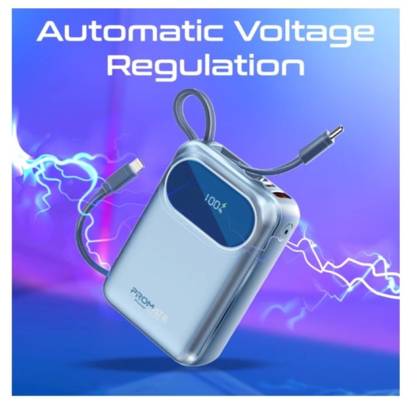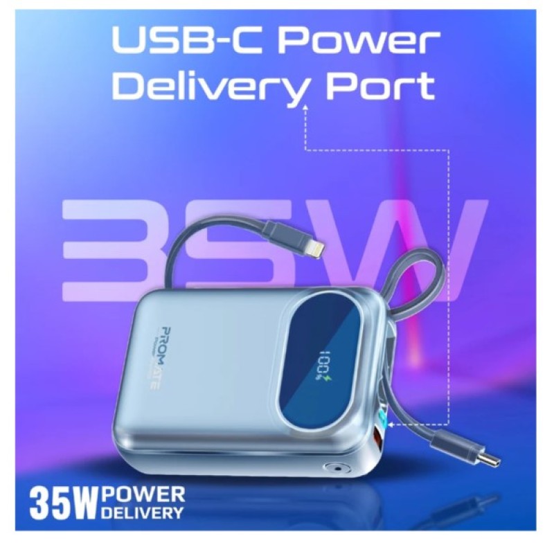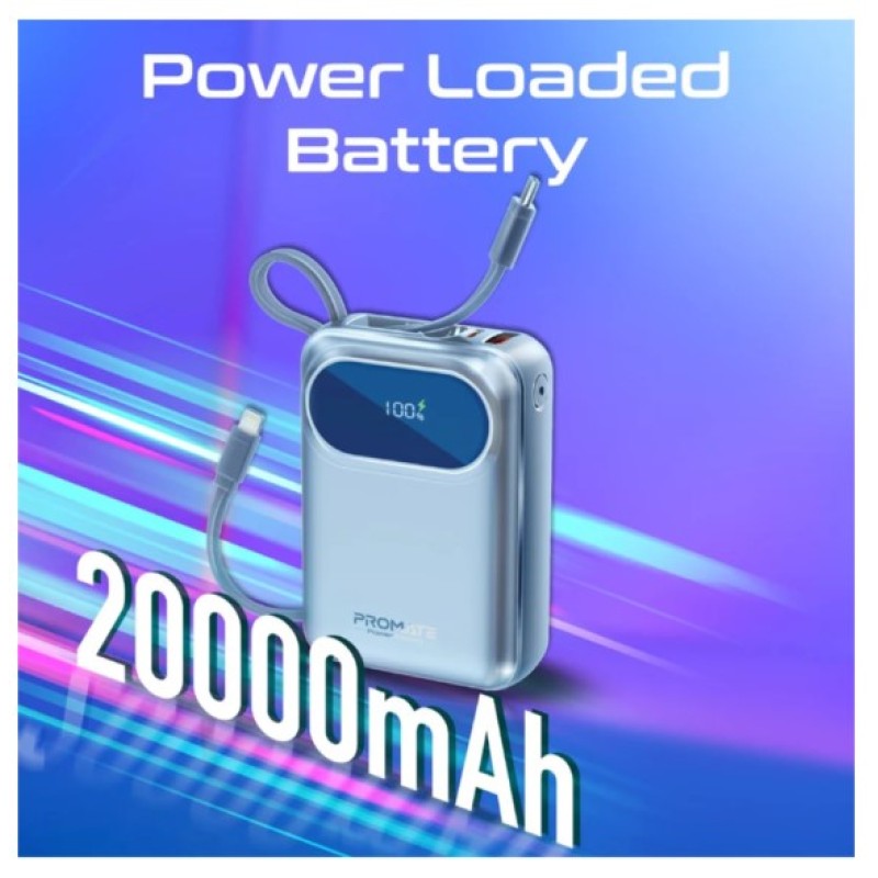 Promate 20,000mAh Ultra Compact 35W SuperSpeed™ Power Bank with Built-In USB-C & Lightning Cable, POWERPOD-20 - Blue