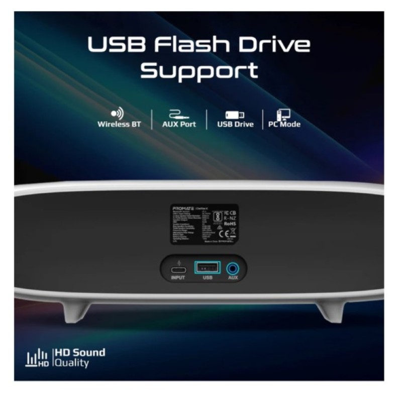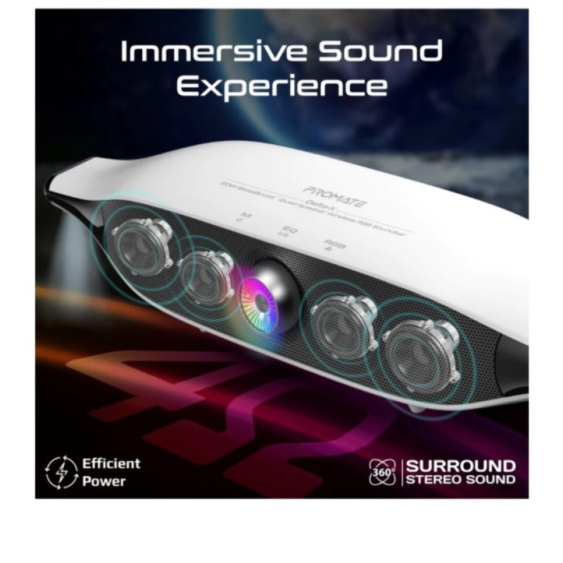 · Introducing Promate’s Delta-X, a superior quality TWS speaker that delivers powerful stereo sound with a 20W speaker output. Designed with a futuristic, sleek spaceship aesthetic, it features 12 dynamic RGB lighting modes and two "landing lights" on the sides that respond to voice levels, creating a visually immersive experience.