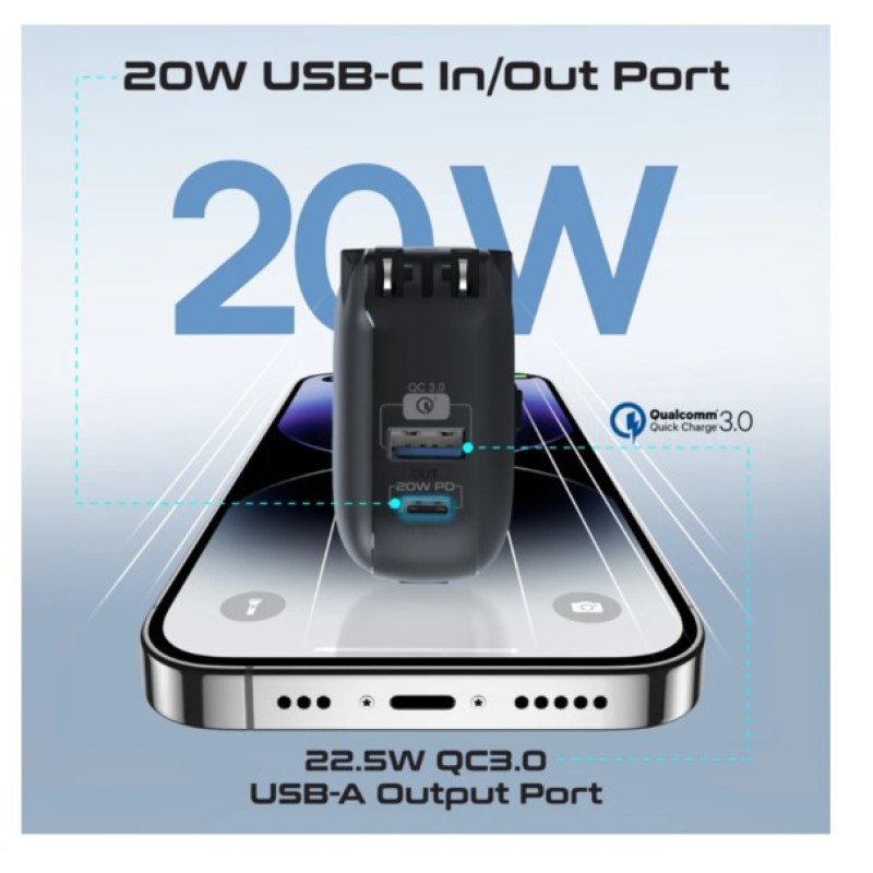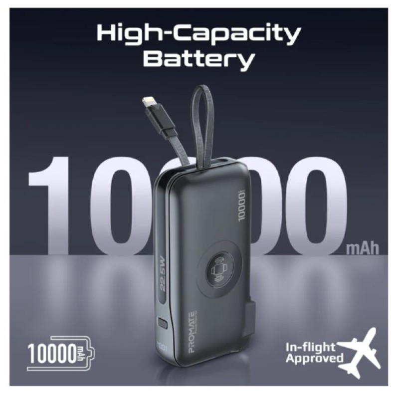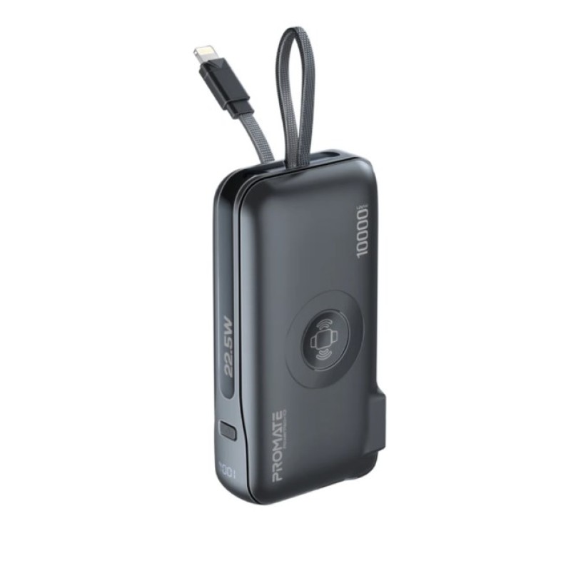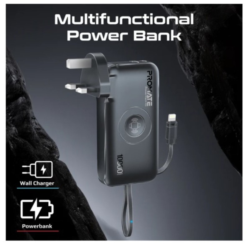 · Discover Promate’s PowerPack-10i, your ultimate companion for seamless power on the go. This compact marvel integrates a 10000mAh battery with a 20W USB-C in/out port, a 22.5W QC3.0 USB-A output port, integrated USA 2-pin AC plug, plus 2-pin EU and 3-pin UK plug adapters and a built-in 20W Lightning output cable for Apple devices. It doesn’t stop there—enjoy the convenience of a 2.5W wireless Apple Watch charger, AC/DC dual mode charging, simultaneous charge and discharge support, automatic voltage regulation, a robust multi-protection system, and a digital display for real-time monitoring. Whether you’re traveling or simply navigating a busy day, the PowerPack-10i ensures your devices stay powered with efficiency and reliability.