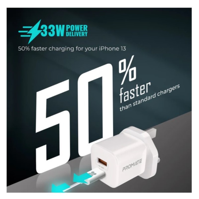 Promate 33W Power Delivery GaNFast™ Charging Adapter, White - PowerPort-33