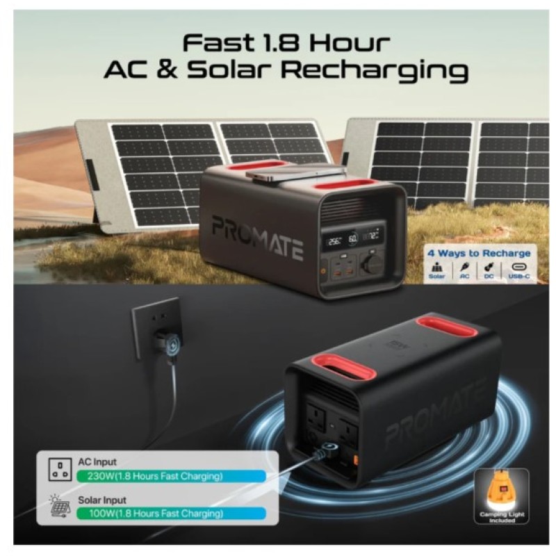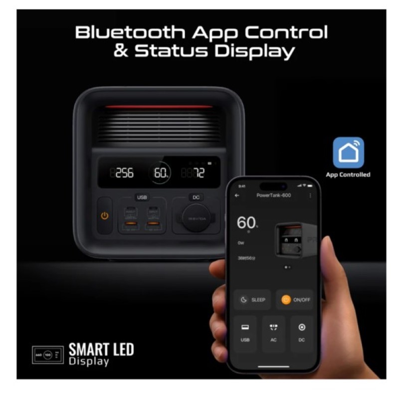 · Take power anywhere with PowerTank-600, a compact 600W portable power station built for adventure, emergencies, and off-grid setups. Featuring a robust 161000mAh LiFePO4 battery with 4500+ cycles, it offers ultra-safe, long-lasting power wherever life takes you. Power up to 8 devices via dual AC 600W ports, USB-C PD100W/PD30W, QC3.0 USB-A ports, DC car socket, and a 15W wireless charger for ultimate versatility. Fast recharging in just 1.8 hours via AC or solar keeps you ready. Stay in control using Bluetooth 5.0 with app connectivity for real-time monitoring and management from up to 10 meters. With built-in IC protection, SOS alarm, and a high-contrast display, PowerTank-600 is your reliable portable power companion.
