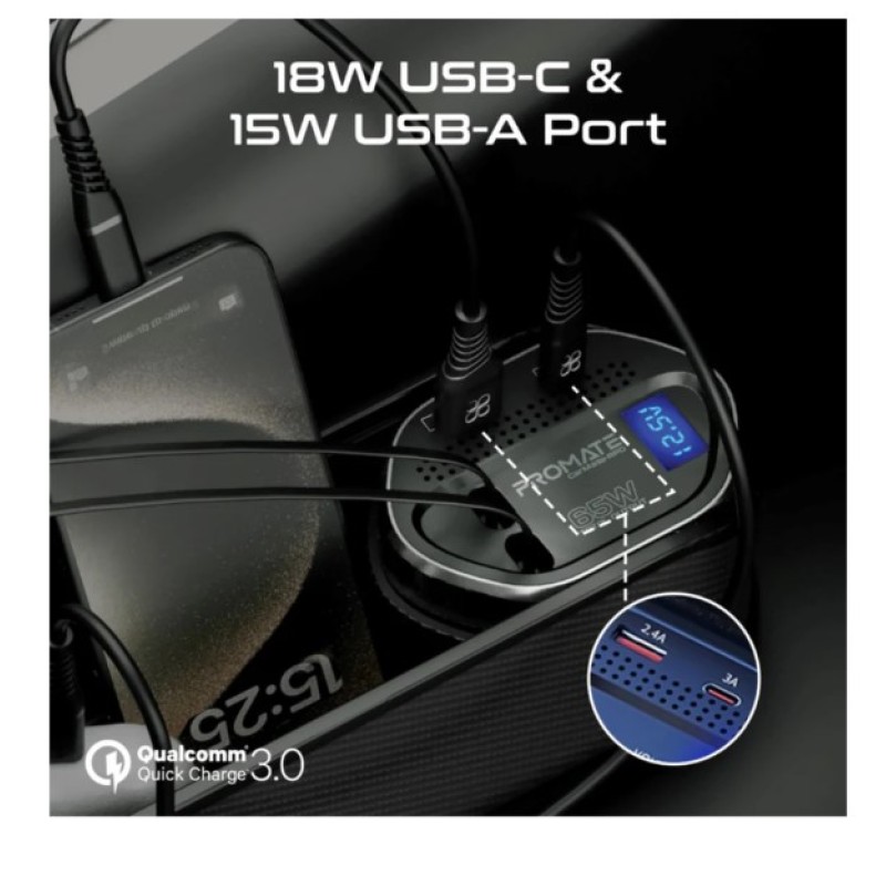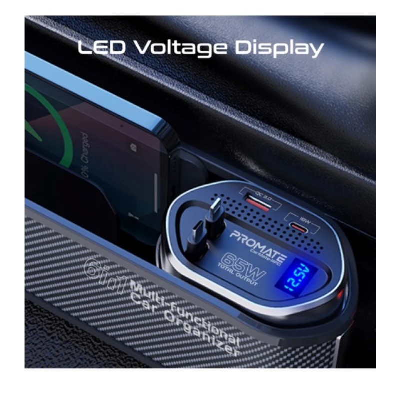 ·       Revamp your car's interior with the CarMate-RPD by Promate, a revolutionary multi-functional car organizer and powerful 65W charging station. Equipped with retractable PD30W Type-C and PD20W Lightning cables, an 18W USB-C port, a 15W USB-A port, as well as a convenient storage section, CarMate-RPD provides fast charging and additional storage for you and your passengers. The included car charger, with removable Type-C cable, fits 12-24V car charger sockets, making it perfect for any vehicle. Upgrade your drive with CarMate-RPD's unmatched convenience and efficiency.
