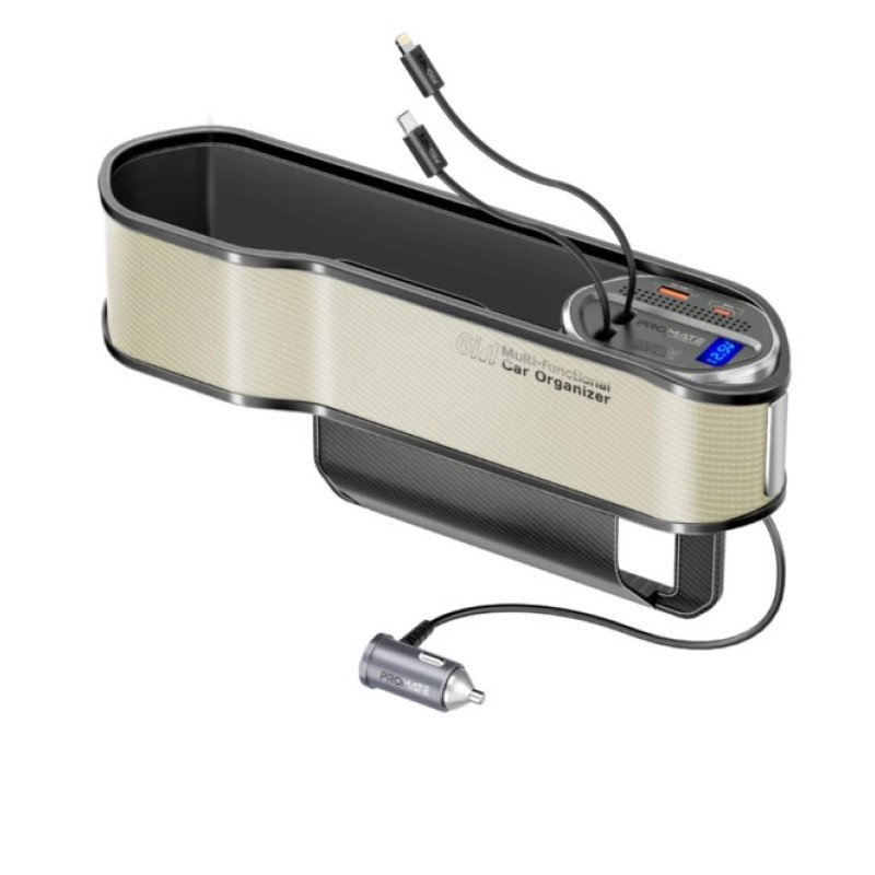 Promate 65W Multi-Functional Car Organizer and Charging Station with USB-C & Lightning Retractable Cables, Beige - CarMate-RPD
