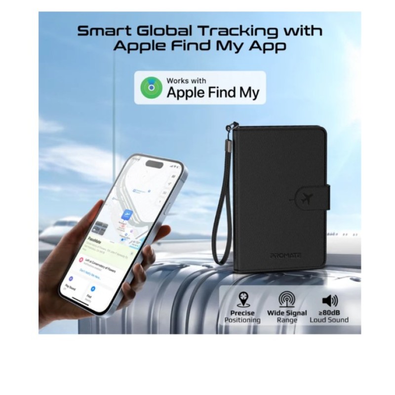 Promate Anti-Loss Slim Leather Passport Holder with RFID Protection & Smart Tracking, Black - PassMate