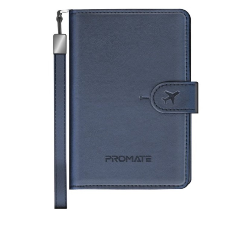 Promate Anti-Loss Slim Leather Passport Holder with RFID Protection & Smart Tracking, Blue - PassMate