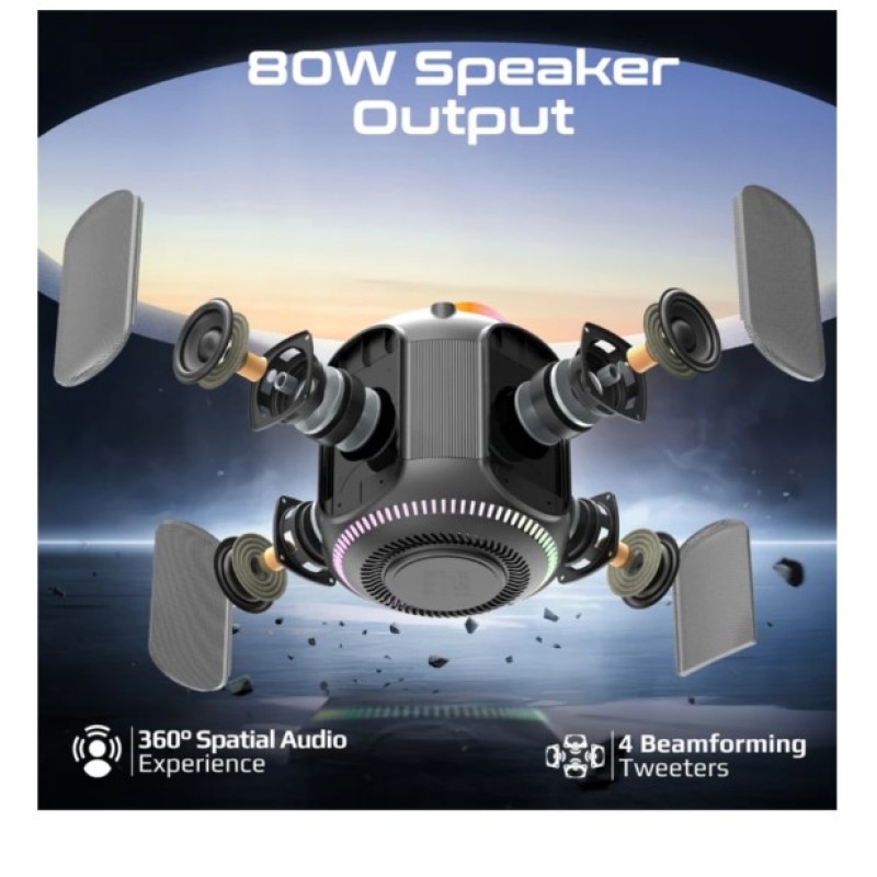 ·       Enjoy versatile connectivity with five audio playback options, including TF card, USB drive, AUX, and even a 1 / 4” guitar port for jamming along to your favourite tunes! The vibrant RGB lights set the mood with five dynamic modes, while the built-in handle with RGB lights adds a touch of style and portability. IPX5 water resistance makes it perfect for outdoor adventures, and quick music navigation keeps you in control. Strike-80 combines function, design, and performance in one powerhouse speaker.