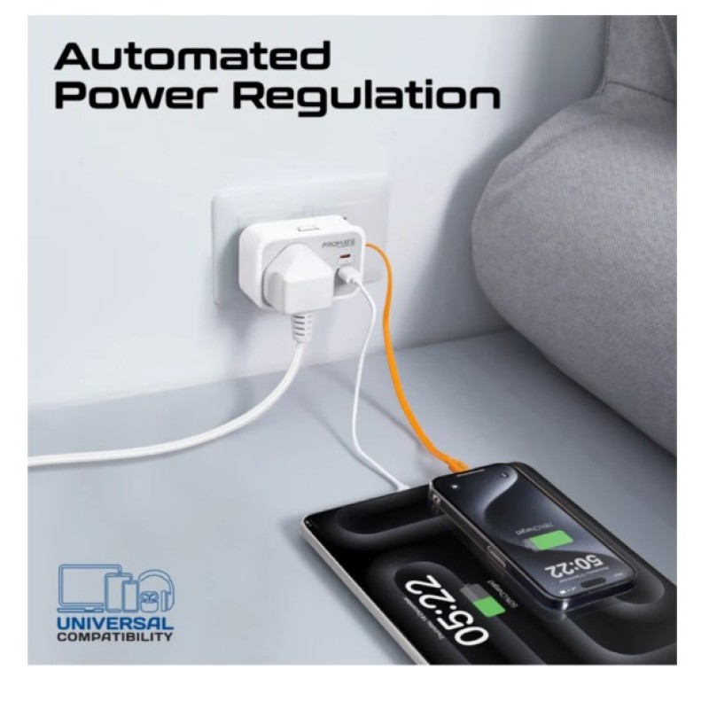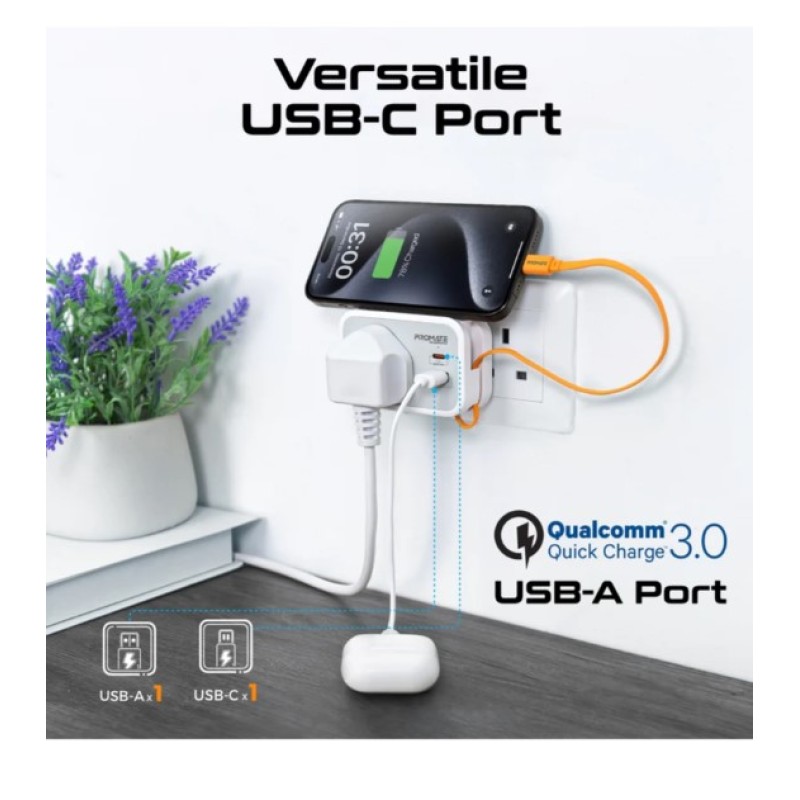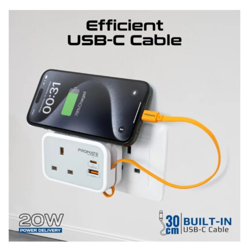 · Promate’s VersaSocket is the versatile power solution for modern living. With integrated PD20W Type-C and 18W USB-A QC3.0 outputs as well as a PD20W integrated cable, Versasocket can charge up to 3 devices quickly and safely, whilst still retaining its 3250W AC output for powering another appliance or device. Its innovative space-saving design and integrated cable management, fits seamlessly into any environment, while advanced safety features like short circuit protection, automated power regulation, overload protection and heat-resistant construction guarantee reliable and safe operation. VersaSocket is the smart, powerful, and secure way to keep your life charged and connected.