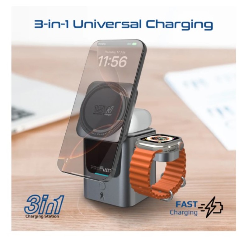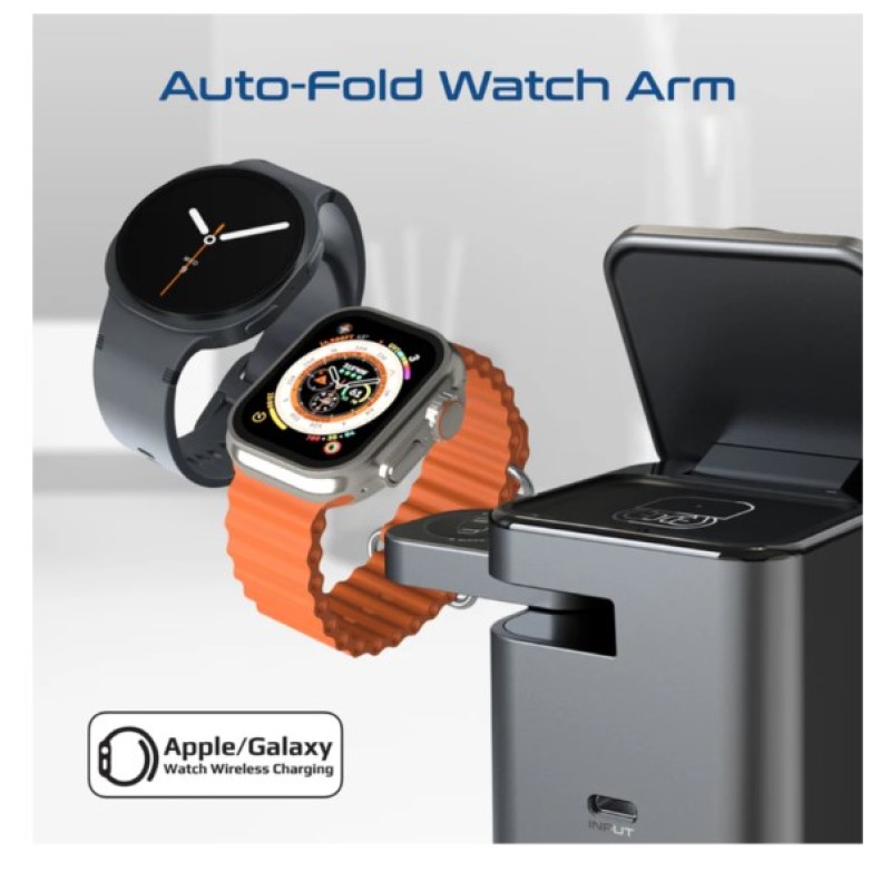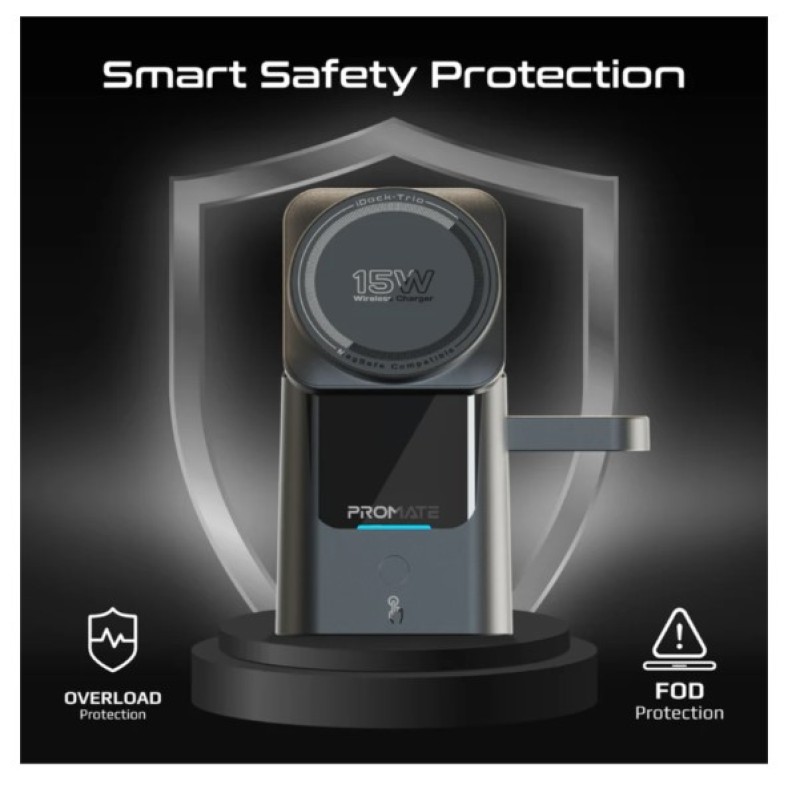 ·       Meet iDock-Trio, the next-generation motorized wireless charging station built for effortless charging. Designed to power your iPhone, Apple Watch, AirPods, or even Samsung devices—all at once—this ultra-compact 3-in-1 dock blends futuristic tech with daily convenience. With a touch-activated auto-flipping MagSafe charging panel and a auto-fold watch charging arm, enjoy true one-handed operation like never before. Built from premium ABS and silicone, it ensures durability and a stable grip for every device. Enhanced with advanced safety chipsets, iDock-Trio offers overheat protection, overcharge defense, and foreign object detection to keep your gear safe. Stay fully powered, faster, and smarter—all from one sleek station.
