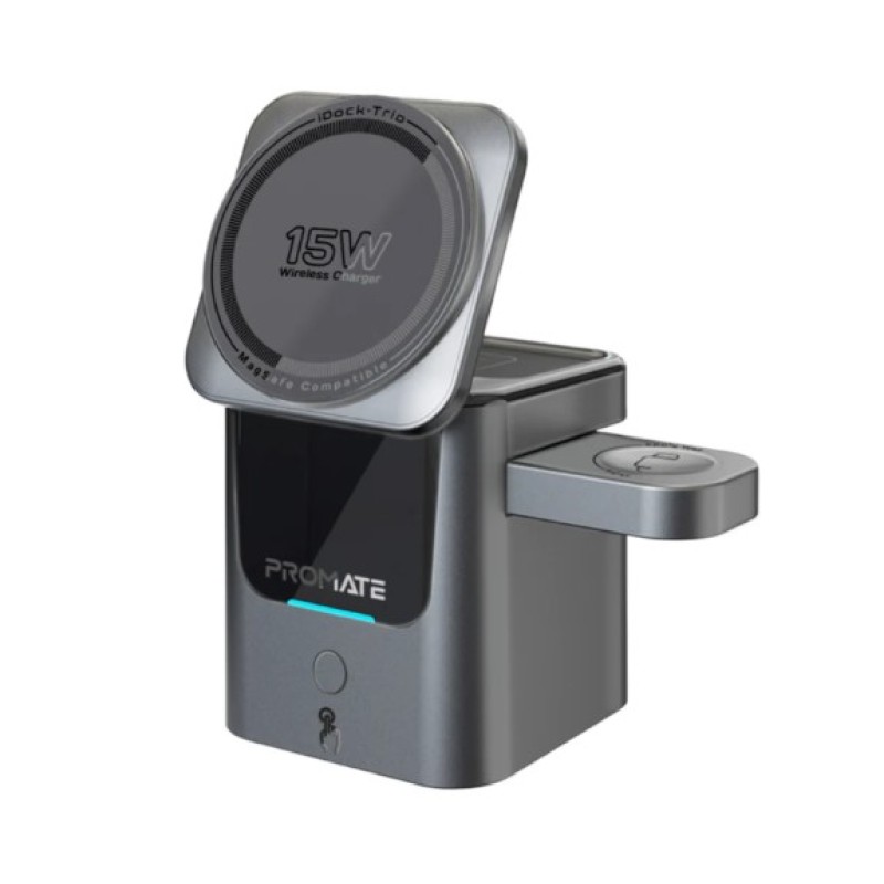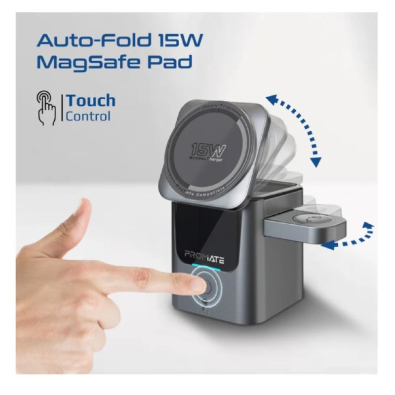 Promate Ultra-Compact Auto-Fold 15W MagSafe Compatible Wireless Charging Station - iDock-Trio