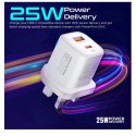 · Charge quicker and more efficiently with PowerPort-25AC. Equipped with a 25W USB-C Power Delivery port and an 18W QC 3.0 USB port, PowerPort-25AC adapts according to the device connected for the safest maximum output per port. Engineered to provide optimum charging with built-in protection against excessive voltage, current, temperature control, overheating, and overcharging, this handy wall charger is reliable and protects your connected devices, while charging your devices at ultra-fast speeds. Boasting a 200V-240V voltage and UK the PowerPort-25AC wall charger can be used in multiple countries.