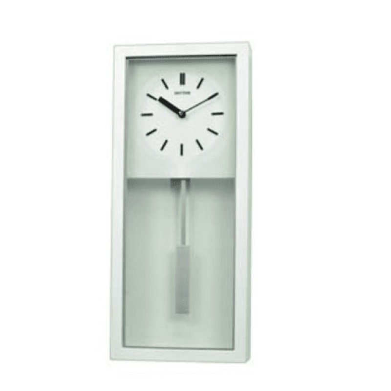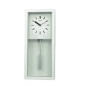 • The wall clock boats a stylish wooden surround with a white finish. It features a dial made from silver dashes, stylish black straight hands and a silver pendulum. It's modern and contemporary style means it will look great on any wall.