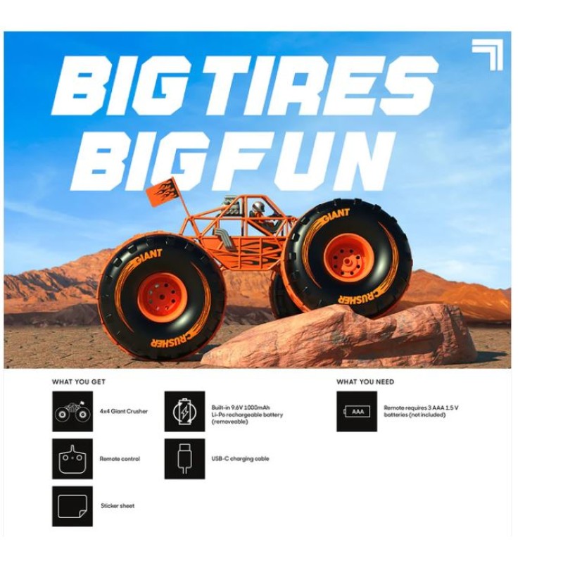 · Discover the ultimate off-road RC monster truck that can conquer any terrain with ease, thanks to its enormous wheels, 4x4 drive system, and large shocks for handling and stability. Its incredibly tight turning radius allows for skillful navigation between obstacles when going over them isn't possible. Extend your adventures into the night with the ultra-bright LED headlights, perfect for nighttime play. The truck's USB-C quick-charging battery provides up to 15 minutes of driving fun per charge and recharges in just 120 minutes. Take on any landscape with the long-travel suspension, all-terrain traction, and speeds reaching 5 MPH. Customize your truck with the included sticker sheet and effortlessly control it from up to 100 ft. away with the reliable and interference-free 2.4 GHz wireless remote control.