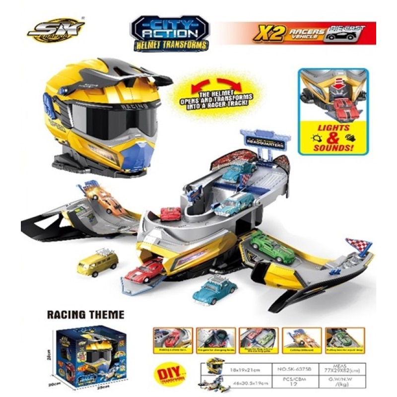 with this helmet-transformed racetrack playset!