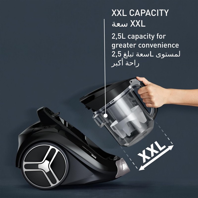 · XXL CAPACITY: An impressive 2.5 L capacity to cover all sizes of living spaces, for a canister vacuum cleaner that offers greater autonomy and convenience