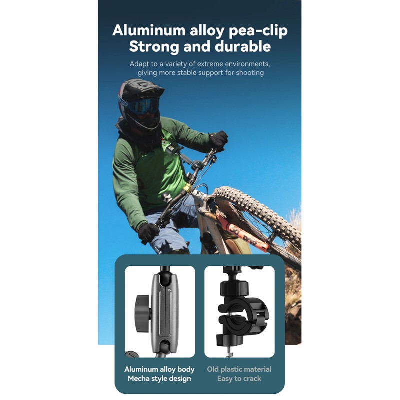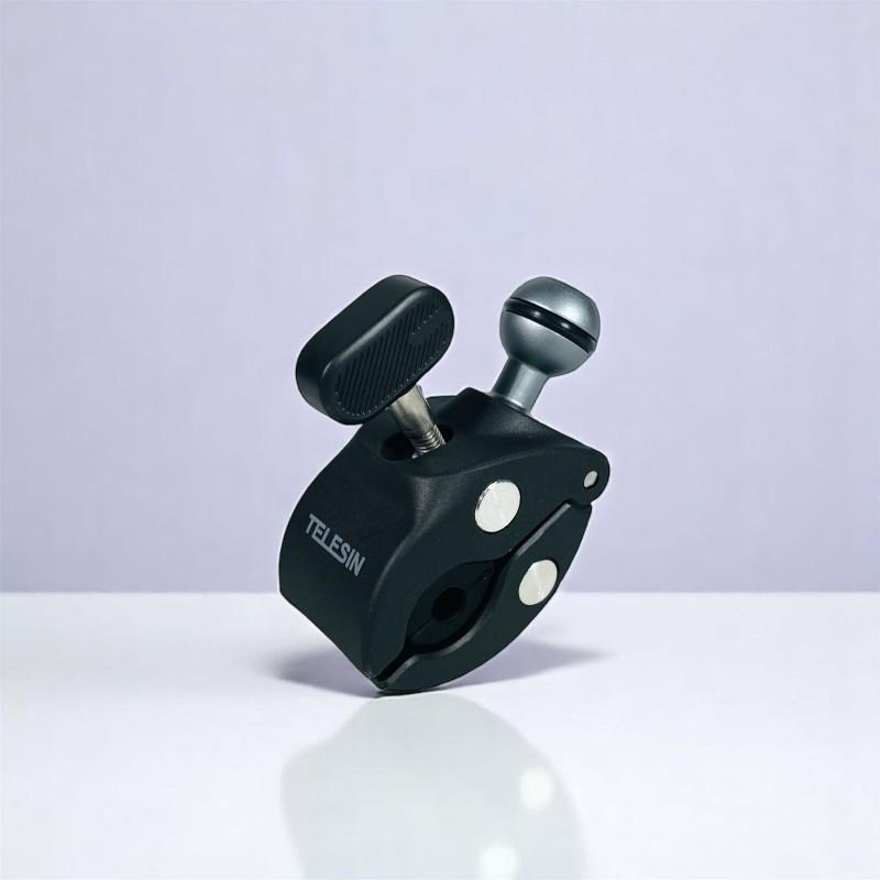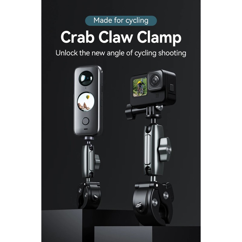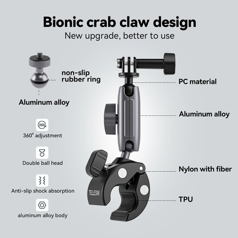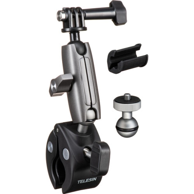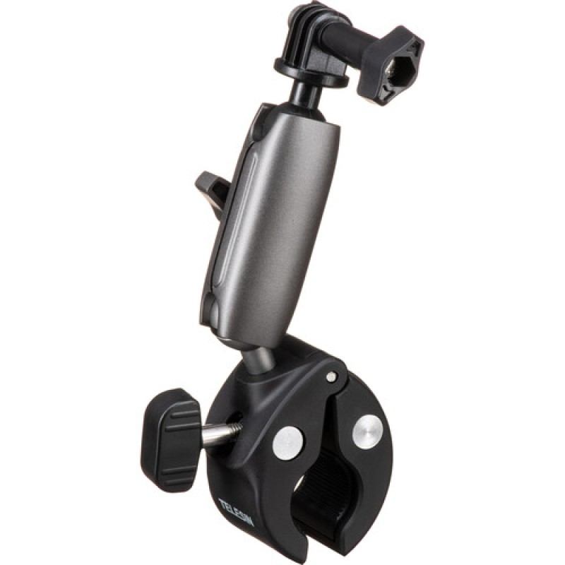 ·       Securely mount your action camera onto a rod, handlebar, or pole with this Aluminum Universal Handlebar Mount from TELESIN. The mount consists of a crab-style clamp, a 360° adjustable ball head mount with a 1/4"-20 mounting screw, and a 3-prong action camera adapter. The mount can support a variety of action cameras such as a GoPro HERO or DJI Action.
