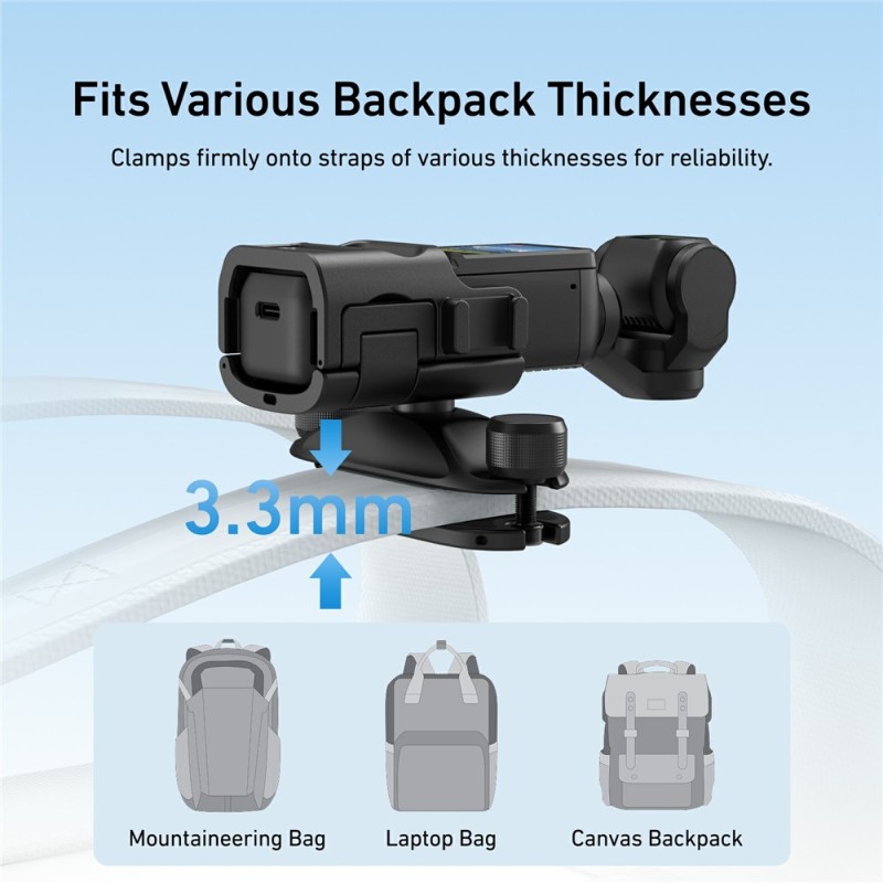· Enjoy the convenience of recording your travel moments with the TELESIN quick release backpack mount, specially designed for DJI Osmo Pocket 3. With a practical design, this mount allows you to record hands-free by simply attaching the camera to the backpack strap. Suitable for hiking, traveling, cycling, and other outdoor activities.